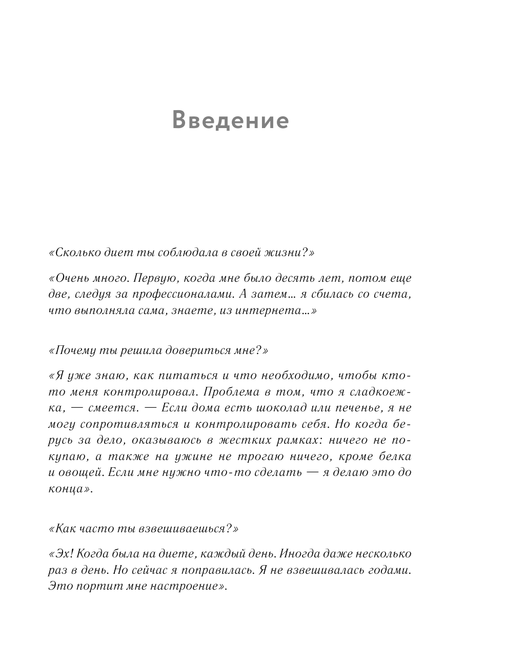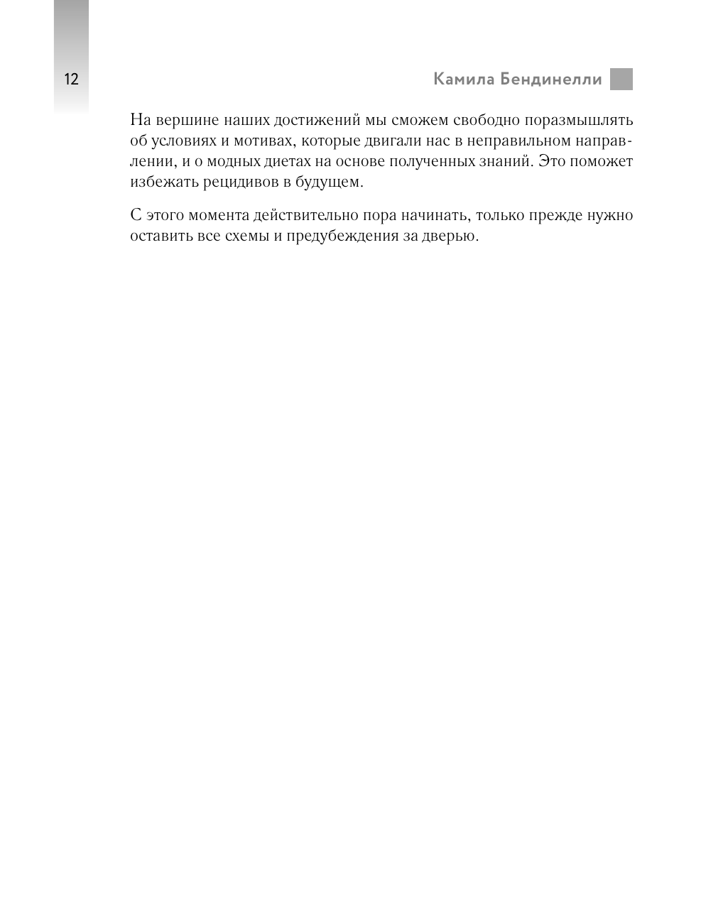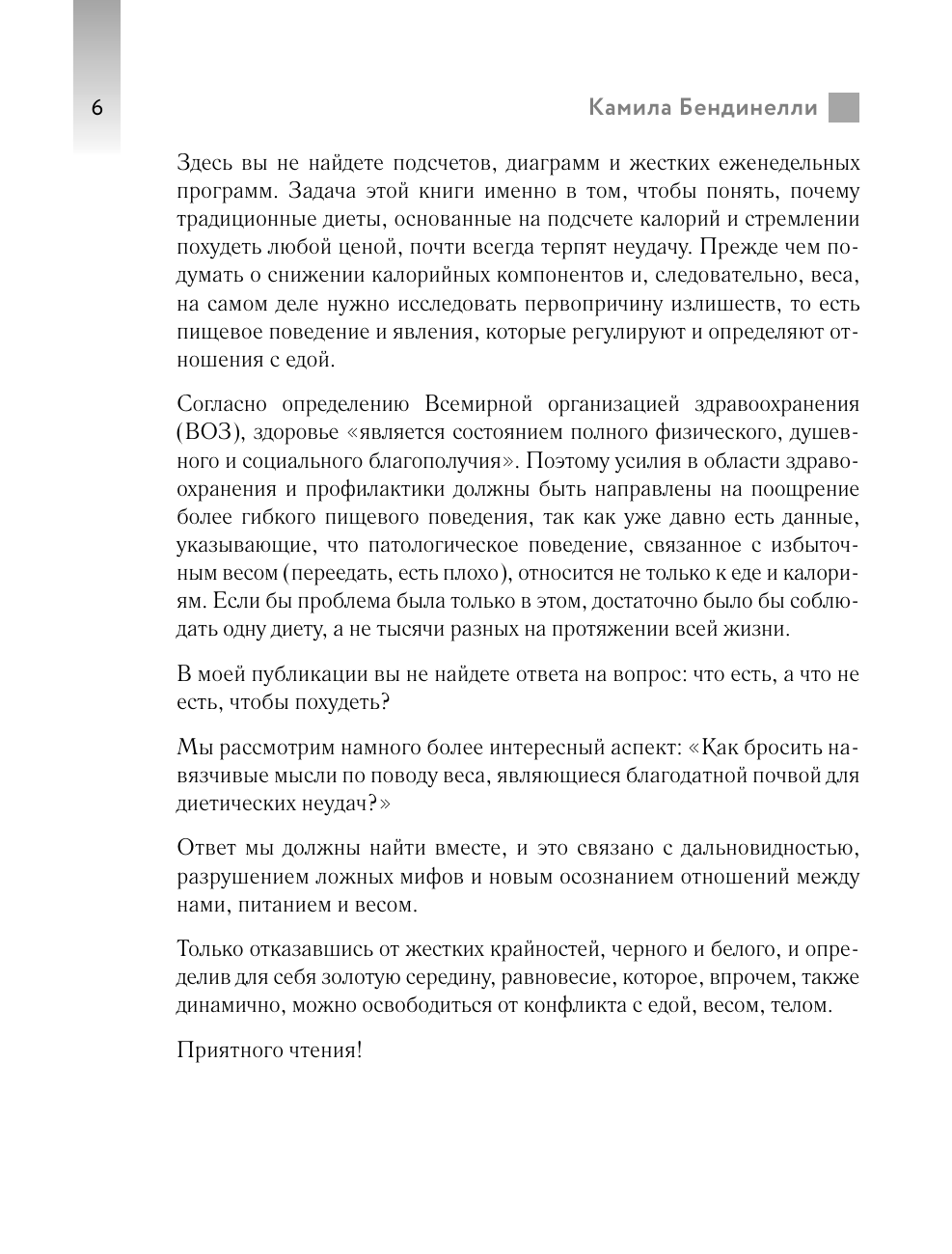 «Почему я не могу устоять перед этой шоколадкой? Она так и манит меня!», «Снова объелся на ночь! Почему я такой безвольный?», «Сегодня был такой сложный день, кажется, пора поднять себе настроение мороженым». Знакомые фразы? Часто ли вы корите себя за лишний кусочек пиццы, съеденный за ужином, и сокрушаетесь о том, что в этом году снова не успели подготовиться к лету? Итальянский диетолог Камилла Бендинелли расскажет вам о том, как разорвать порочный круг диет и перестать загонять себя в рамки. Она уверена, достаточно лишь научиться слушать и СЛЫШАТЬ свой организм, чтобы прийти в форму и, главное, удержать ее надолго. Без боязни сорваться и бесконечных запретов.