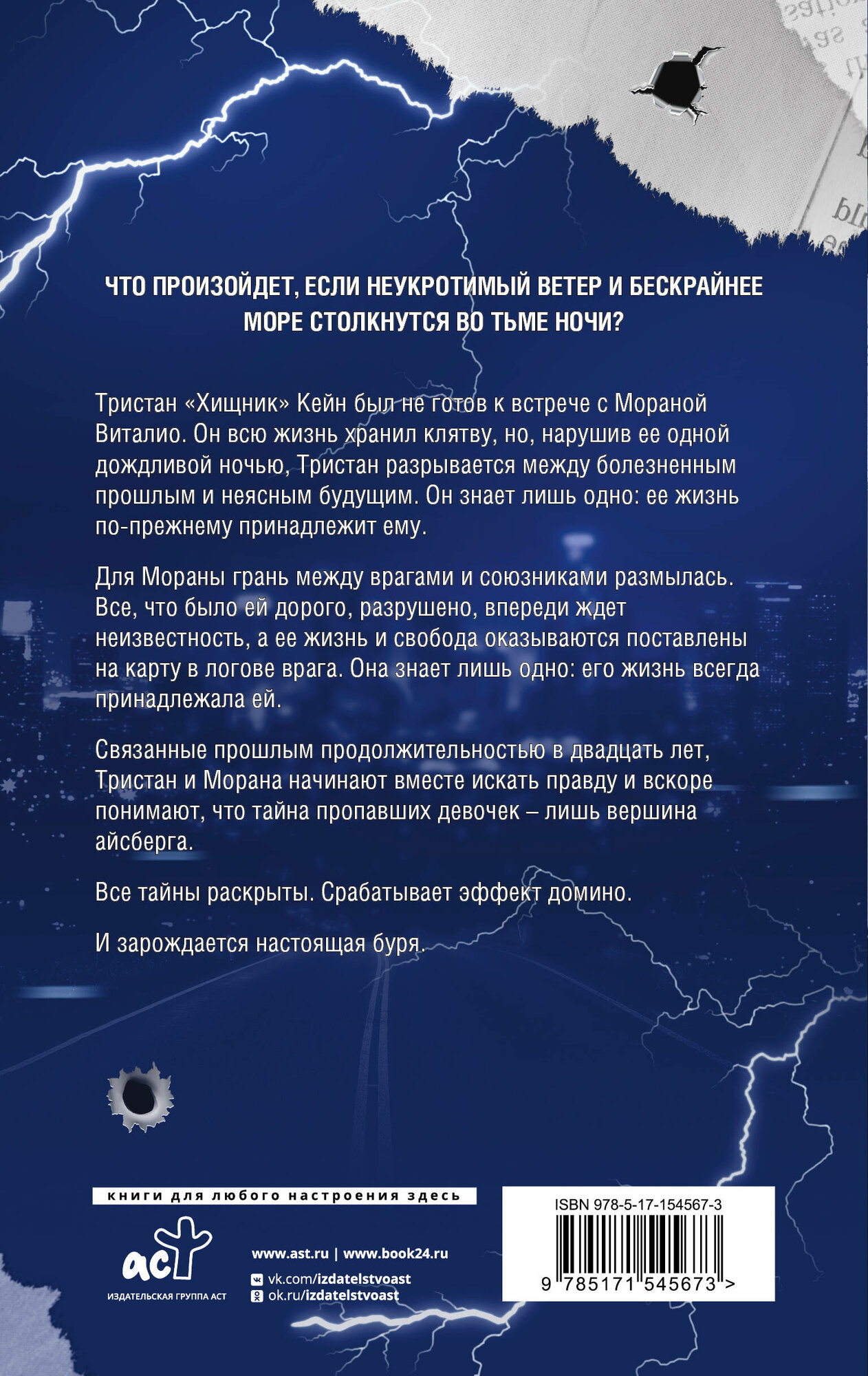 ЧТО ПРОИЗОЙДЕТ, ЕСЛИ НЕУКРОТИМЫЙ ВЕТЕР И БЕСКРАЙНЕЕ МОРЕ СТОЛКНУТСЯ ВО ТЬМЕ НОЧИ? Тристан «Хищник» Кейн был не готов к встрече с Мораной Виталио. Он всю жизнь хранил клятву, но, нарушив ее одной дождливой ночью, Тристан разрывается между болезненным прошлым и неясным будущим. Он знает лишь одно: ее жизнь по-прежнему принадлежит ему. Для Мораны грань между врагами и союзниками размылась. Все, что было ей дорого, разрушено, впереди ждет неизвестность, а ее жизнь и свобода оказываются поставлены на карту в логове врага. Она знает лишь одно: его жизнь всегда принадлежала ей. Связанные прошлым продолжительностью в двадцать лет, Тристан и Морана начинают вместе искать правду и вскоре понимают, что тайна пропавших девочек – лишь вершина айсберга. Все тайны раскрыты. Срабатывает эффект домино. И зарождается настоящая буря.