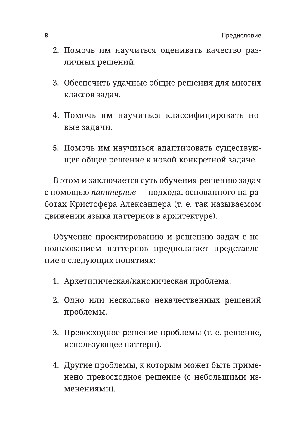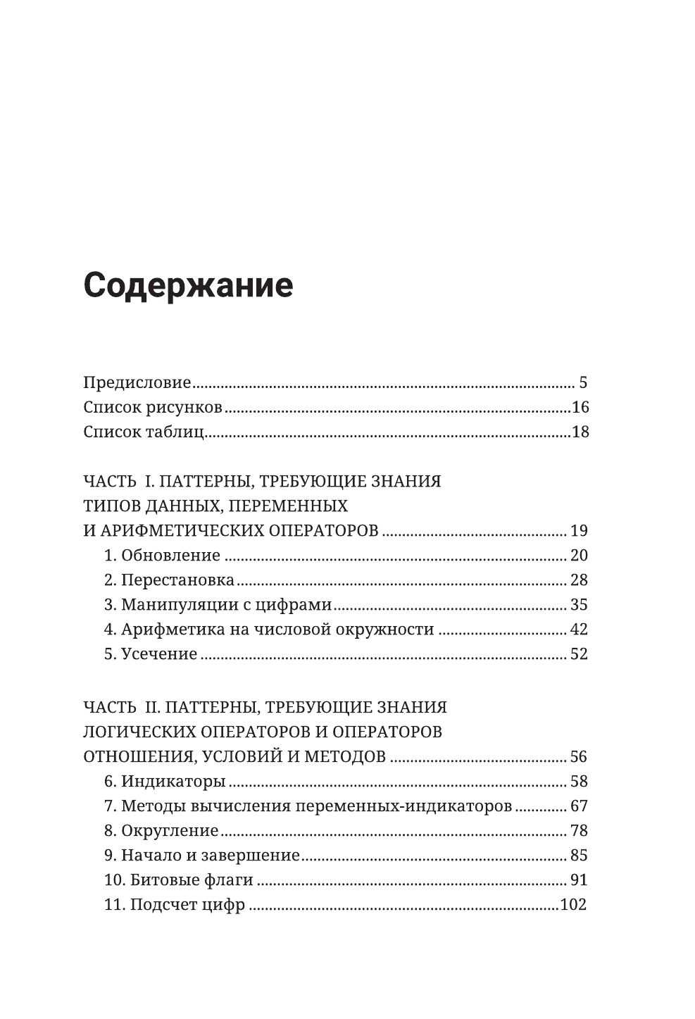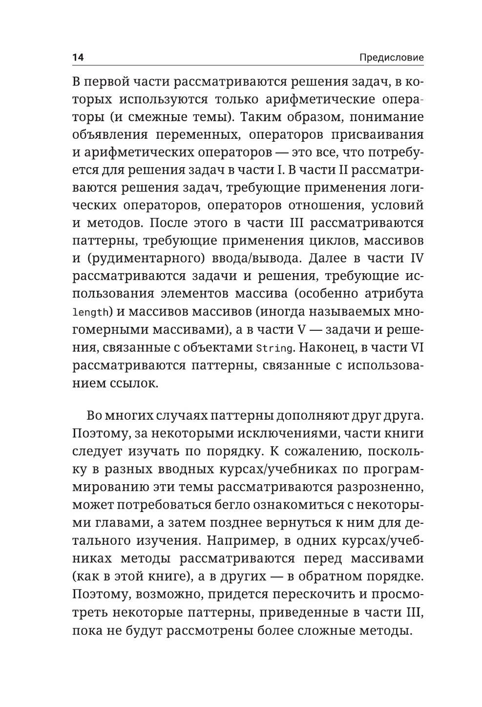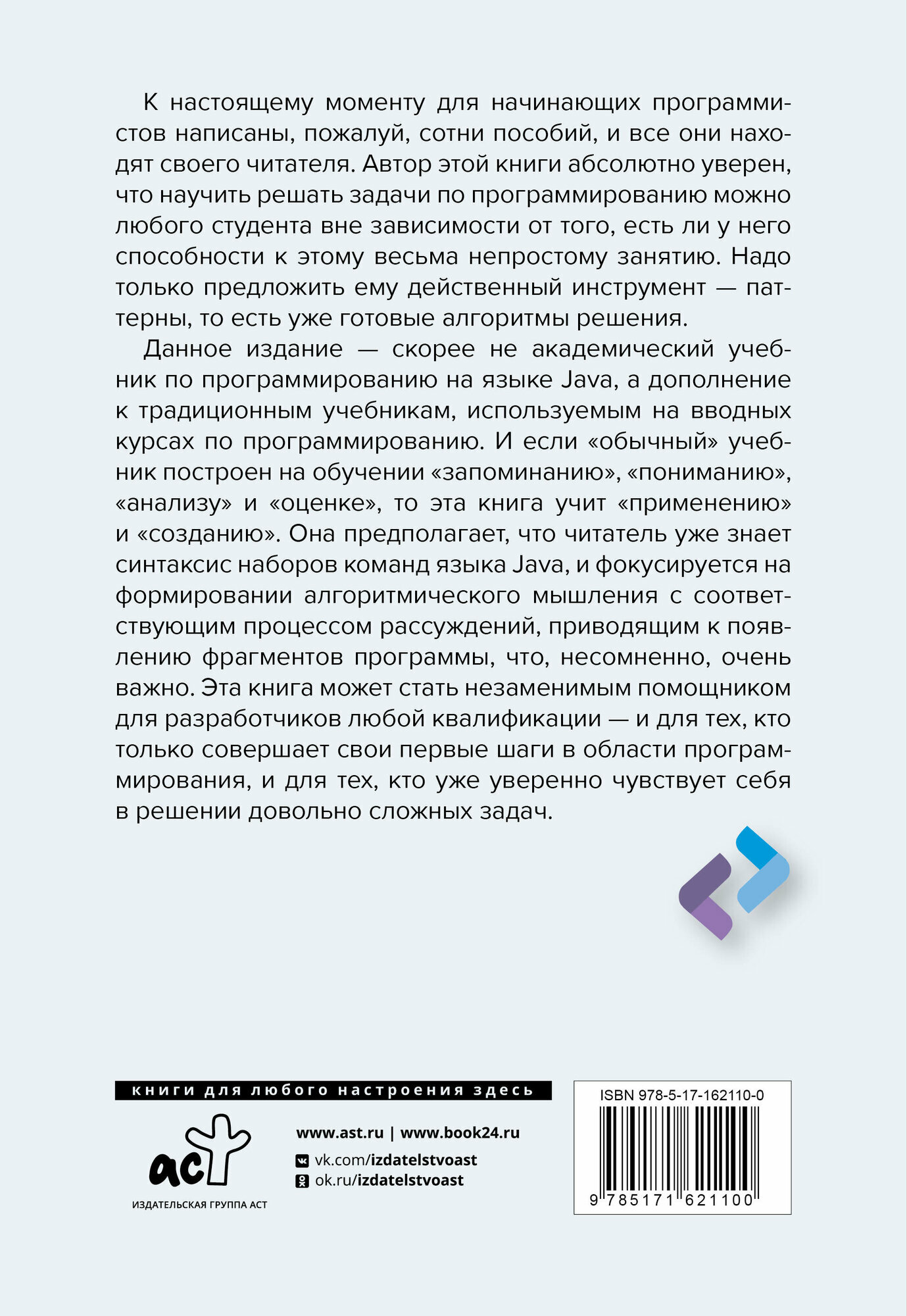 В этой книге, призванной научить начинающего программиста решать конкретные задачи по программированию на языке Java, вводится понятие паттерна — некоего заранее заготовленного «рецепта» решения, который можно применить в виде готового фрагмента кода. Используя впоследствии данный набор паттернов, молодой разработчик сможет на их основе быстро решать довольно сложные составные задачи. Представленные здесь паттерны часто предлагают наряду со стандартными алгоритмами эффективные альтернативные методы решения самых распространенных задач в области программирования. Приведенная в книге библиотека паттернов охватывает обширную область, начиная с примитивного обновления переменной и заканчивая работой со ссылочными данными. Кроме того, рассмотрены такие темы, как манипуляции с цифрами, входящими в состав числа, арифметика на числовой окружности, применение переменных-индикаторов и переменных-аккумуляторов, конформные и сегментированные массивы, операции с отдельными битами и многие другие.