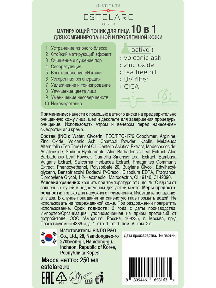 Тоник для лица для комбинированной и проблемной кожи матирующий с цинком 10 в 1 Institute Estelare 250мл Main Co. Ltd. (2141636)
