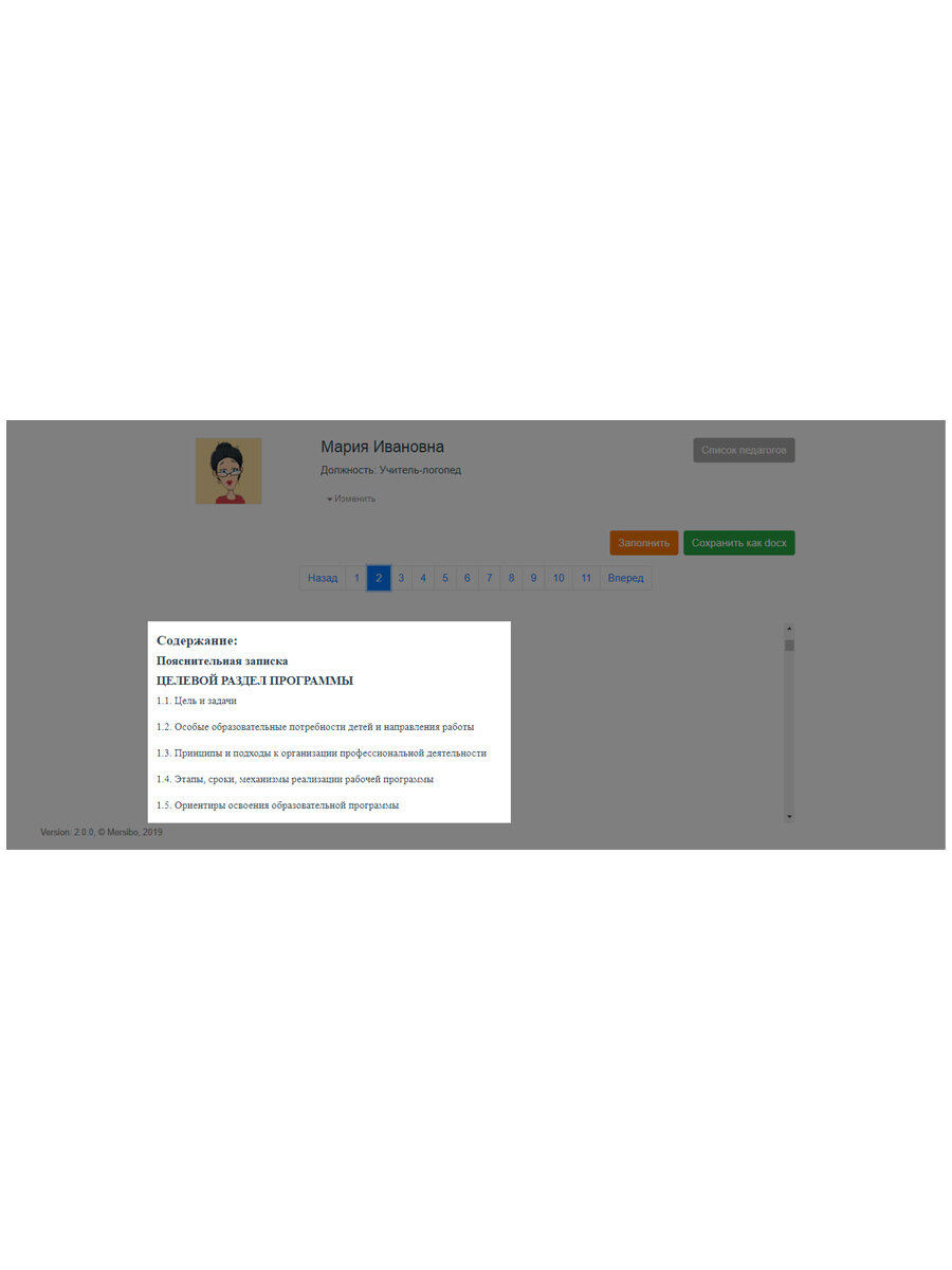 Конструктор поможет быстро и качественно сделать рабочую программу коррекционным специалистам при работе с дошкольниками. Конструктор помогает сэкономить много времени: программу, которую вы обычно делаете целый день или дольше, в Конструкторе можно сделать за 2-3 часа. Для каких специалистов Конструктор поможет сделать рабочую программу: - логопедам, - дефектологам, - сурдопедагогам, - тифлопедагогам, - олигофренопедагогам. Для каких организаций Программа подойдет для лекотек, дошкольных групп, дефектологических и логопедических кабинетов и пунктов. Готовая программа со всеми разделами На выходе вы получите программу в полном объеме: от титульного листа до мониторинга развития детей. Останется только распечатать или отправить по почте. Экономия времени и сил Рабочая программа формируется автоматически. Там, где требуется персонализация, вы выбираете свой вариант. Варианты также формируются автоматически, вам не надо вспоминать правильные формулировки и писать их вручную. Такая автоматизация сэкономит силы и время. Адаптация под специалиста Конструктор гибкий, он подстроится под специфику вашей работы: группу, возраст и диагноз детей, условия и место работы. Разделы программы и варианты ответов формируются на основании этих данных. Соответствие требованиям ФГОС и аооп Программа учитывает требования ФГОС дошкольного образования и Примерных аооп для детей с ОВЗ раннего и дошкольного возраста. Готовую программу можно использовать при аттестации Как работает программа Вначале вы описываете свою работу: специальность, категорию детей, с какой группой вы работаете и так далее. На основе ответов формируются разделы рабочей программы: пояснительная записка, цели, содержательный раздел и организация. В каждой главе есть персонализированная информация, ее надо заполнить. Перед вами будет текст документа, когда вы нажмете кнопку «Заполнить», появятся варианты ответов. Отмечайте нужные варианты и в конце нажмите кнопку «Сохранить». Заполнять программу можно в несколько заходов, не обязательно все делать сразу. Ранее выбранные ответы можно поменять, если ошиблись или изменились обстоятельства. Обратите внимание, информация, которую вы вносите, хранится на компьютере, а не на флешке. Когда программа готова, нажмите «Сохранить как docx». Откройте файл в Ворд, отредактируйте при необходимости и готово. Взаимодействие с порталом Мерсибо Если вы пользуетесь подпиской на онлайн-игры Мерсибо, то будет еще удобнее: Конструктор автоматически заполнит блок «Интерактивное сопровождение коррекционно-развивающей среды». Для каждой педагогической задачи будут прописаны необходимые игры, подобранные с учетом возраста и особенностей детей.