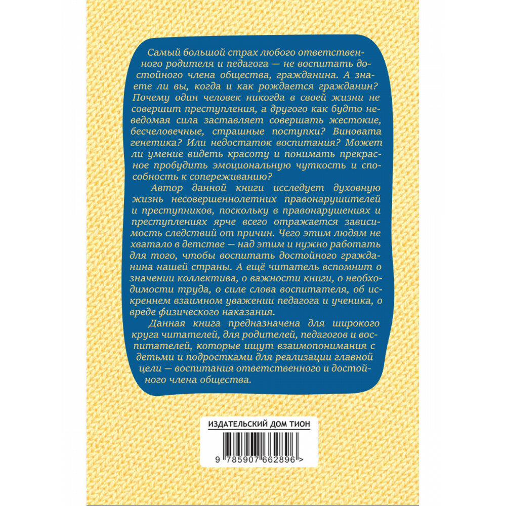 Самый большой страх любого ответственного родителя и педагога — не воспитать достойного члена общества, гражданина. А знаете ли вы, когда и как рождается гражданин? Почему один человек никогда в своей жизни не совершит преступления, а другого как будто неведомая сила заставляет совершать жестокие, бесчеловечные, страшные поступки? Виновата генетика? Или недостаток воспитания? Может ли умение видеть красоту и понимать прекрасное пробудить эмоциональную чуткость и способность к сопереживанию?Автор данной книги исследует духовную жизнь несовершеннолетних правонарушителей и преступников, поскольку в правонарушениях и преступлениях ярче всего отражается зависимость следствий от причин. Чего этим людям не хватало в детстве — над этим и нужно работать для того, чтобы воспитать достойного гражданина нашей страны. А ещё читатель вспомнит о значении коллектива, о важности книги, о необходимости труда, о силе слова воспитателя, об искреннем взаимном уважении педагога и ученика, о вреде физического наказания.Данная книга предназначена для широкого круга читателей, для родителей, педагогов и воспитателей, которые ищут взаимопонимания с детьми и подростками для реализации главной цели — воспитания ответственного и достойного члена общества.