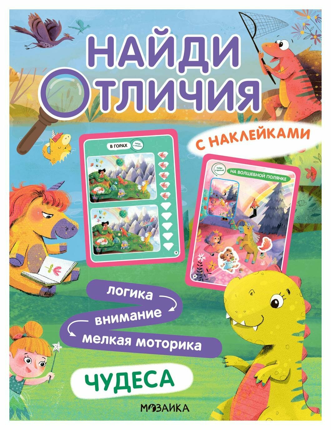 Чудеса (Найди отличия), книжка с наклейками Книга «Чудеса» серии «Найди отличия» содержит классические головоломки, где ребенку нужно разглядывать картинки и искать на них отличия. При этом часть картинок с простой механикой, где у каждой пары картинок нужно отметить по 10 отличий. А часть с наклейками: нужно найти отличия на картинках и сделать их одинаковыми при помощи наклеек. Находить отличия одно из любимейших занятий детей всех возрастов. А еще это отличный способ развить внимание, наблюдательность и мелкую моторику.