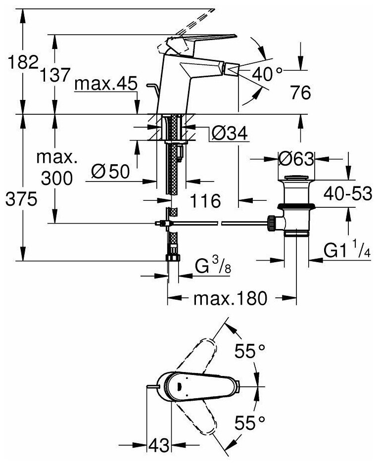 Однорычажный смеситель для биде с донным клапаном, керамический картридж GROHE SilkMove® ?35 мм, ограничитель температуры, расход воды 12 л/мин с возможностью установки минимального расхода 2.5 л/мин, система GROHE QuickFix™ Plus для быстрого монтажа, рекомендуемое рабочее давление 1 - 5 бар, хромированная поверхность GROHE StarLight®, подключение - гибкая подводка 3/8"х350 мм.