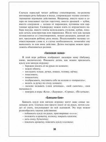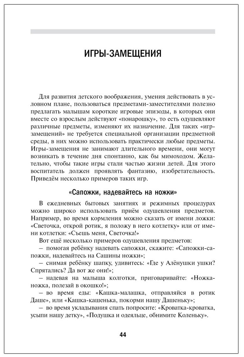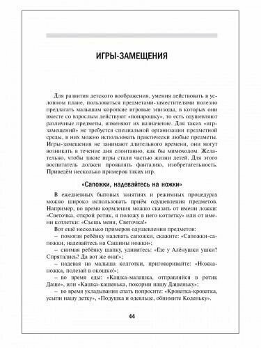 Методические материалы к комплексной образовательной программе для детей раннего возраста «Первые шаги» подробно характеризуют особенности игровой деятельности детей 1-3 лет, этапы её становления. Автор даёт рекомендации педагогам, как создать адекватную предметную среду для развития процессуальной игры, как разнообразить действия детей, пробудить у них воображение, инициативу. Пособие содержит описание разнообразных сюжетов для процессуальных игр и игр-замещений.
