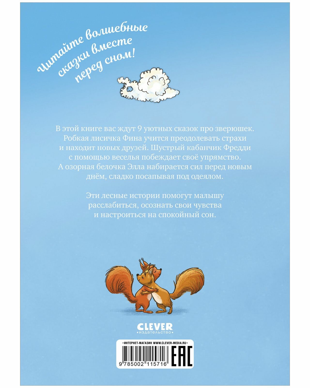 В этой книге вас ждут 9 уютных сказок про зверюшек.Робкая лисичка Фина учится преодолевать страхи и находит новых друзей. Шустрый кабанчик Фредди с помощью веселья побеждает своё упрямство. А озорная белочка Элла набирается сил перед новым днём, сладко посапывая под одеялом. Эти лесные истории помогут малышу расслабиться, осознать свои чувства и настроиться на спокойный сон.