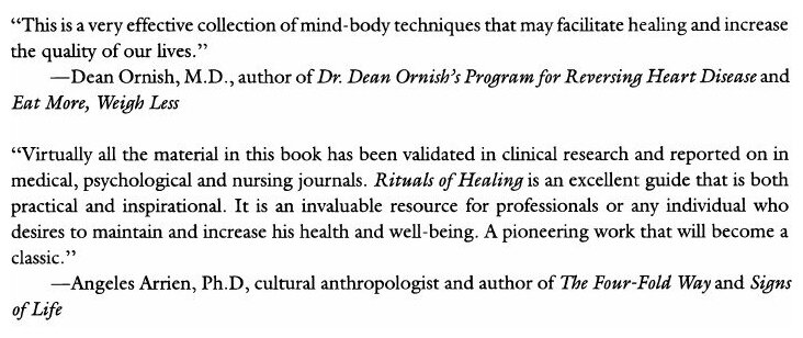 A practical guide to using the powers of the mind and the imagination to form rituals that can help the body restore and maintain health Winner of the American Journal of Nursing Book of the Year Award As the success of Bill Moyers's bestselling Healing and the Mind shows, the mind-body connection is widely and enthusiastically accepted. Rituals of Healing uses the mind-body connection to develop remarkable techniques for healing-which it presents with the inspiring stories of patients who have used them successfully. Designed to complement and enhance a physician's care and established medical treatment, the rituals in this book can be customized for maximum benefit for any individual. Filled with specific exercises, visualization scripts, and insightful case histories, Rituals of Healing provides caring, attentive guidance through each step of the healing journey.