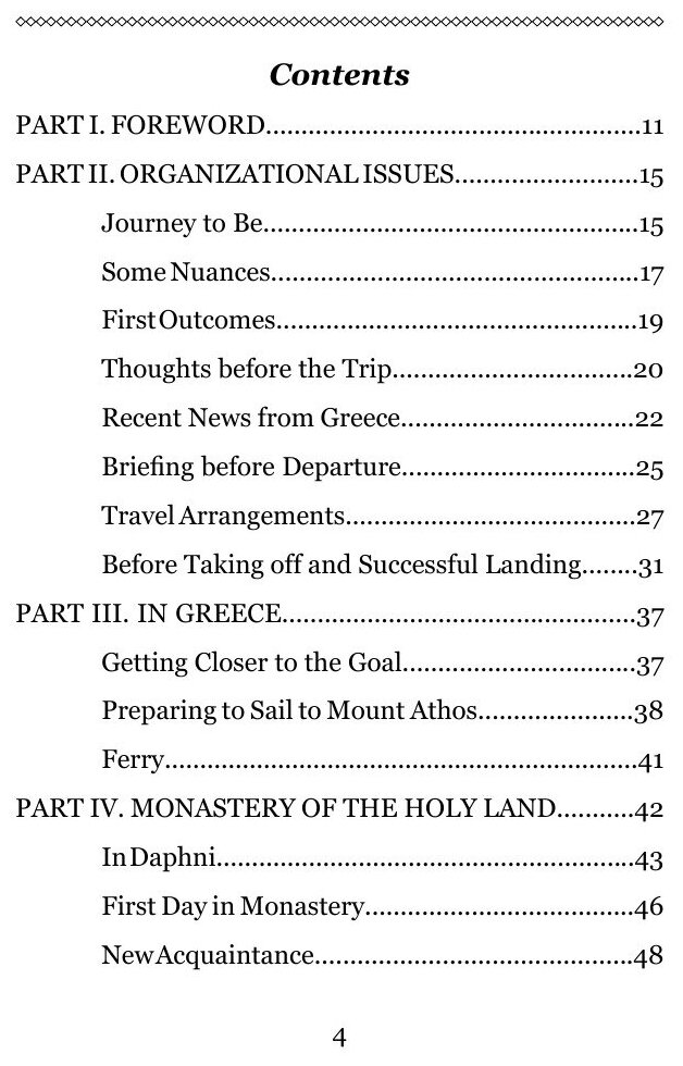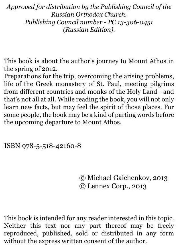 This book is about the author's journey to Mount Athos in the spring of 2012. Preparations for the trip, overcoming the arising problems, life of the Greek monastery of St. Paul, meeting pilgrims from different countries and monks of the Holy Land - and that's not all at all. While reading the book, you will not only learn new facts, but may feel the spirit of those places. For some people, the book may be a kind of parting words before the upcoming departure to Mount Athos.