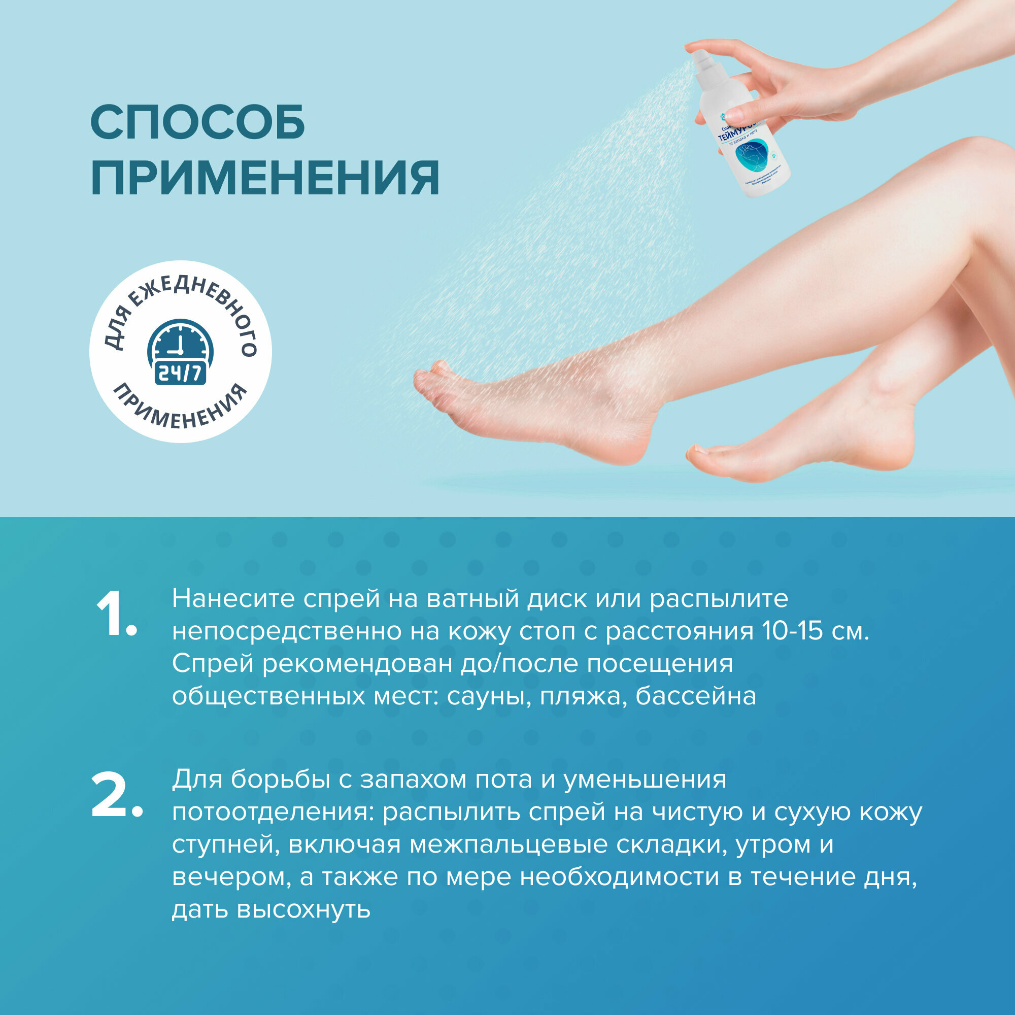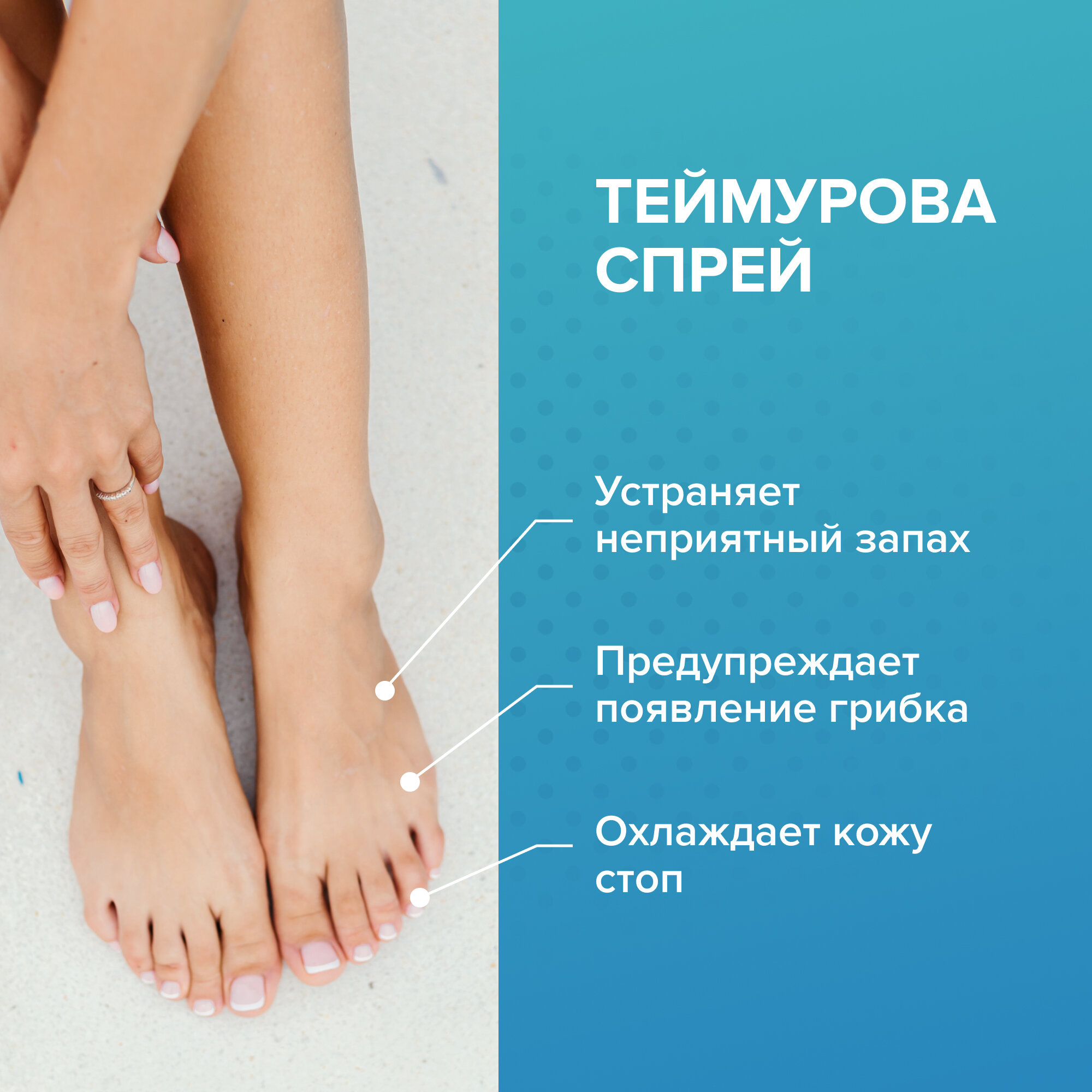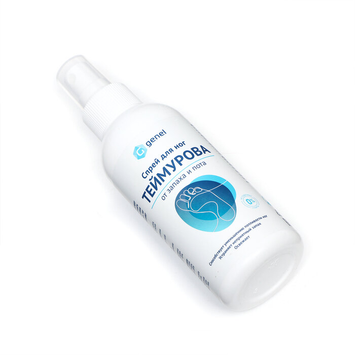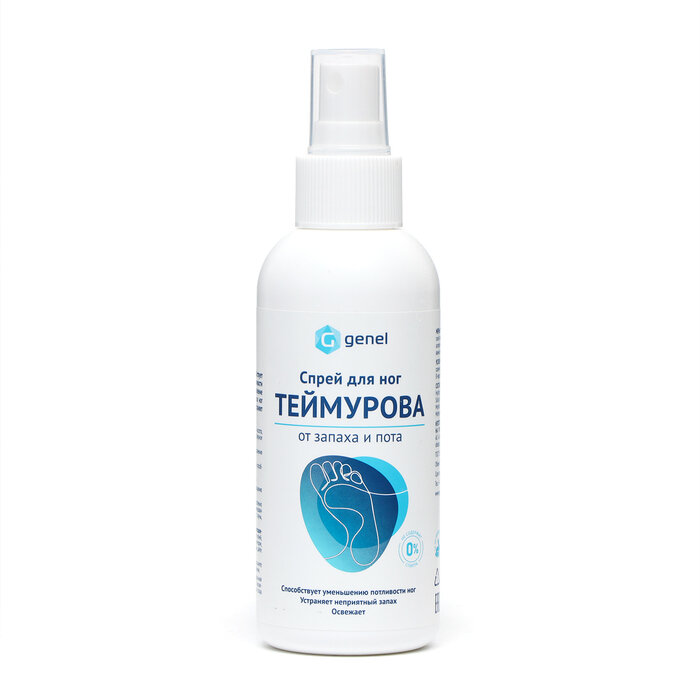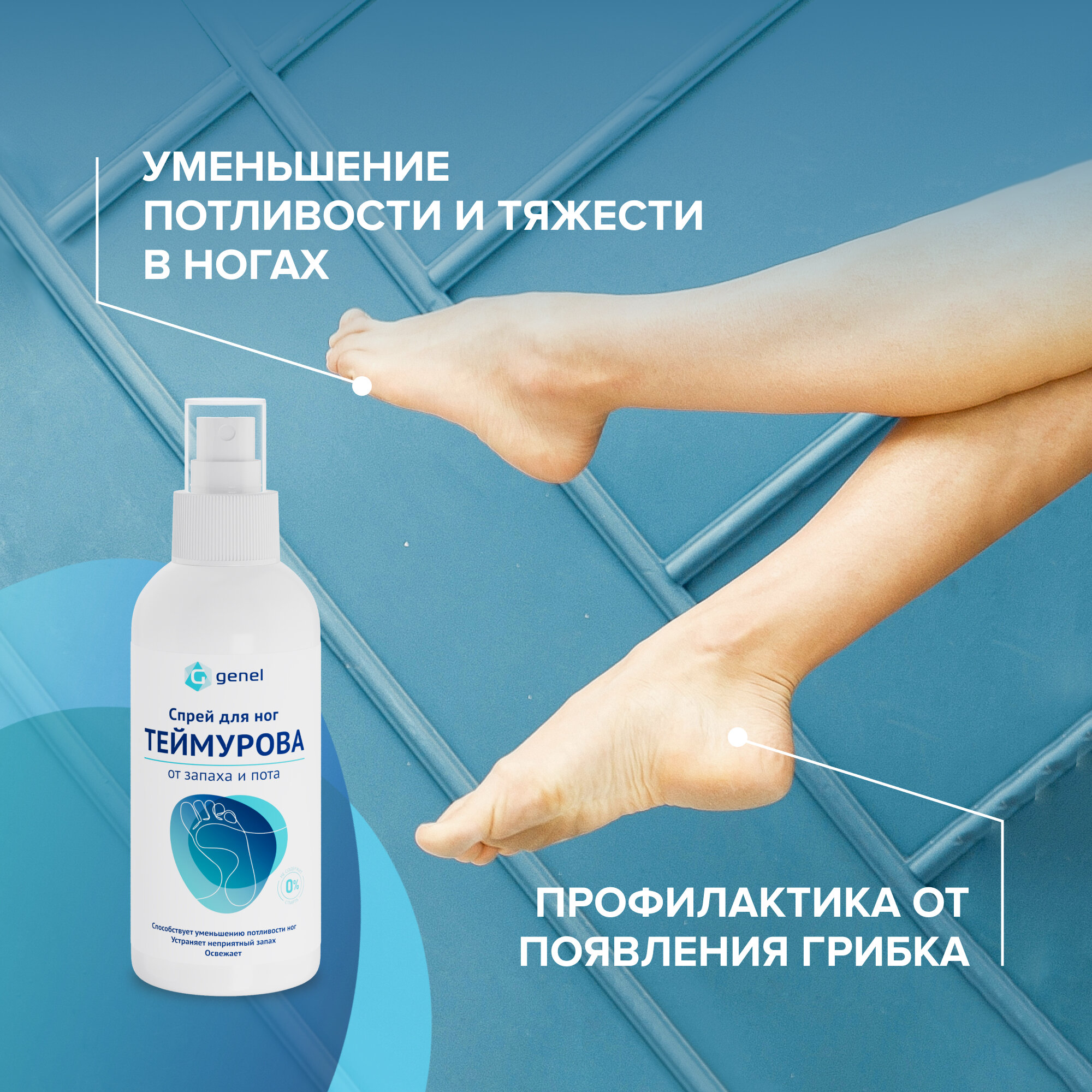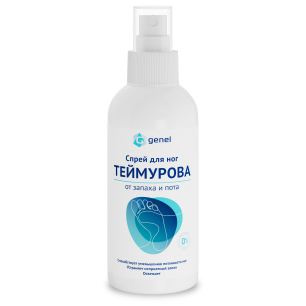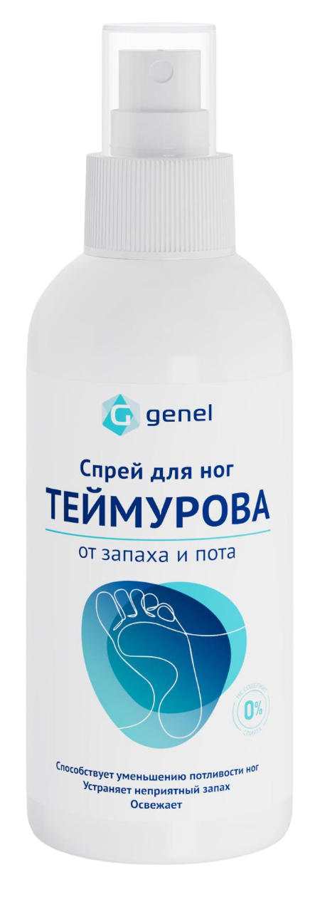 Cпрей для ног ТЕЙМУРОВА от запаха и пота Genel при регулярном применении способствует устранению запаха и избыточной потливости стоп, охлаждает; предупреждает появление грибка в межпальцевых промежутках ног и на ногтях; снимает усталость ног; устраняет неприятный запах в обуви.