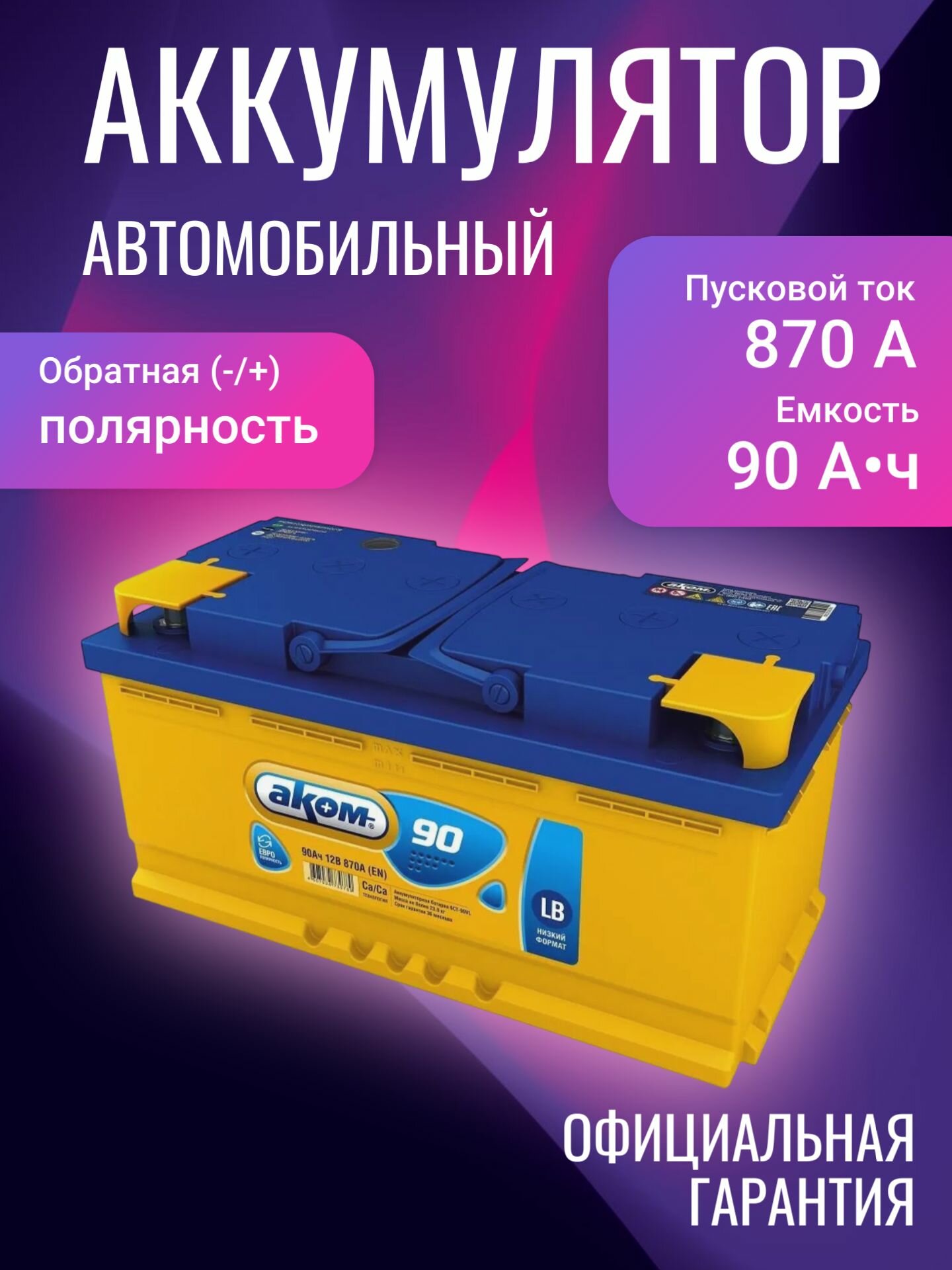 90R (низкий) 870А Обратная полярность 90 Ач (353x175x175) Аком (4607034730789)