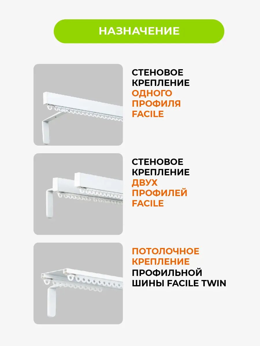 **Держатель для профиля Arttex Facile** — составляющая часть фурнитуры для установки карнизов, выполненная из стали. Конструктивно выполнена в Г-образной форме. В изделии предусмотрено пять отверстий для крепежных деталей — три на одной стороне и два на другой. Предусмотрена специальная декоративная накладка. В наборе имеются саморезы. Установка производится к потолку или стене.