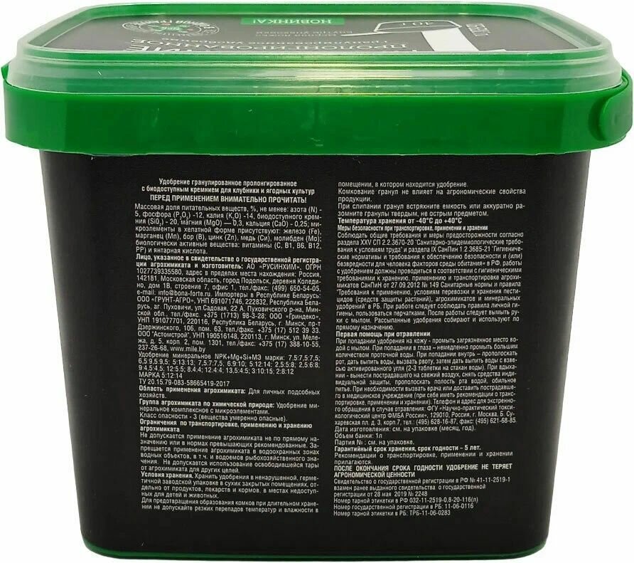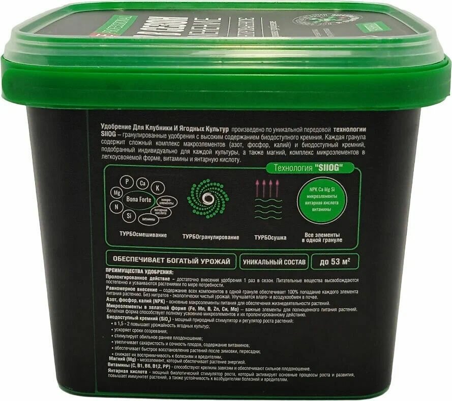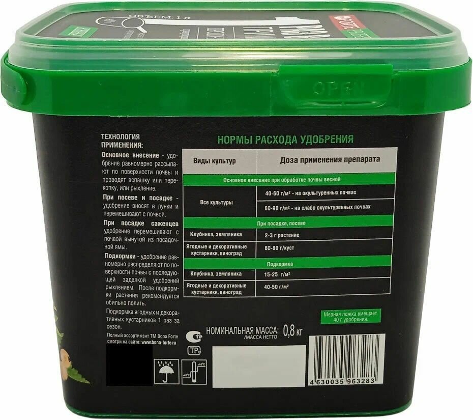 Удобрение в пластиковом ведерке с ручкой, внутри мерная ложка. Грунулы серого цвета, неправильной формы, не калиброваные, без резких запахов. Состав очень и внешний вид очень схожи с удобрением "turbo". Использовал в качестве весенней подкормки клубники. К сожалению явных внешних изменений на всех саженцах не заметил, тк пришлось параллельно бороться с хрущом, но не задетые вредителей заметно прибавили в росте. Вносил в сухом виде под куст, с последующим рыхлением.