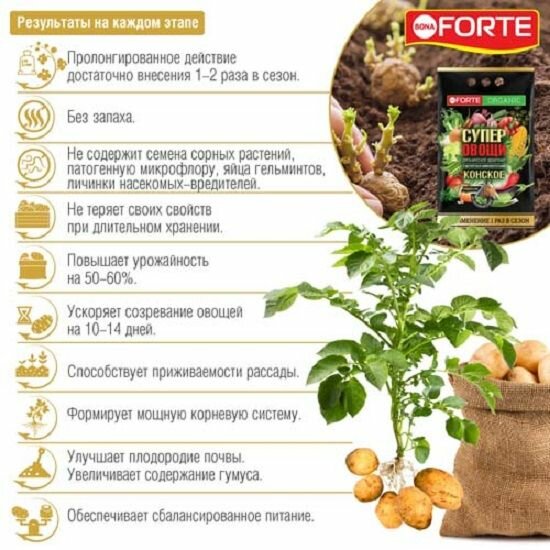 Высококонцентрированное органическое удобрение не имеет резкого запаха и подходит для всех овощных культур. Картофеля, огурцов и томатов. Перца, и тыкв, патиссонов и кабачков. Редиса, свеклы, моркови и др. Предназначено для естественного восстановления и повышения плодородия почвы, обеспечения сбалансированного питания и формирования мощной корневой системы растений, приживаемости рассады, а также ускорения сроков созревания урожая. Преимущества: Пролонгированное действие – достаточно внести 1-2 раза за сезон. Не содержит семена сорных растений, яйца гельминтов или личинок насекомых-вредителей и патогенную микрофлору. Дополнительно обогащен минеральным NPK-комплексом (азот, фосфор и калий). Содержит природный антибиотик и фунгицид. Обеспечивает равномерность внесения за счет гранулированной формы. Применение: на всех типах почв. После внесения обильно полить растения. Основное - равномерно рассыпать гранулы по поверхности почвы и провести вспашку, перекопку или рыхление. При посадке - внести гранулы в рядки или лунки, после этого гранулы необходимо засыпать землей, семена или рассада не должны быть в контакте с удобрением. Подкормки - равномерно распределить гранулы по поверхности почвы или между рядами с последующей заделкой рыхлением и поливом. При подкормке молодых растений настоять гранулы в воде в течение суток, перед внесением тщательно перемешать. При приготовлении почвосмесей для выращивания рассады, укоренения черенков, заполнения теплиц и парников - равномерно рассыпать гранулы и перемешать с почвой. При длительном хранении удобрение не меняет своих свойств. Конский навоз гранулированный, цеолит природный.состав: Три основных макроэлемента (NPK): азот (N) - 3,8 %, фосфор (P2O5) - 3,1 %, калий (K2O) - 4,1 %, биодоступный кремний - 2 %. Аминокислоты, % не менее: аланин - 0,31, аргинин - 0,47, валин - 0,41, гистидин - 0,45, глицин - 0,32, лизин - 0,25, аспарагин и аспарагиновая кислота - 0,51, глутамин и глутаминовая кислота - 0,46, лейцин и изолейцин -0,53, метионин - 0,22, пролин - 0,29, серин - 0,25, тирозин - 0,21, треонин - 0,50, триптофан - 010, фенилаланин - 0,25, цистин — 0,12. Цеолит, входящий в состав удобрения содержит биодоступный кремний (Si02), мезоэлементы Са (кальций) и Mg (магний), микроэлементы в хелатной форме.