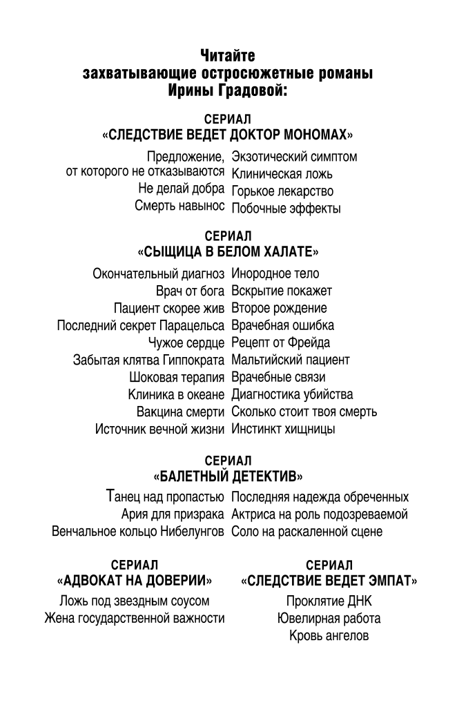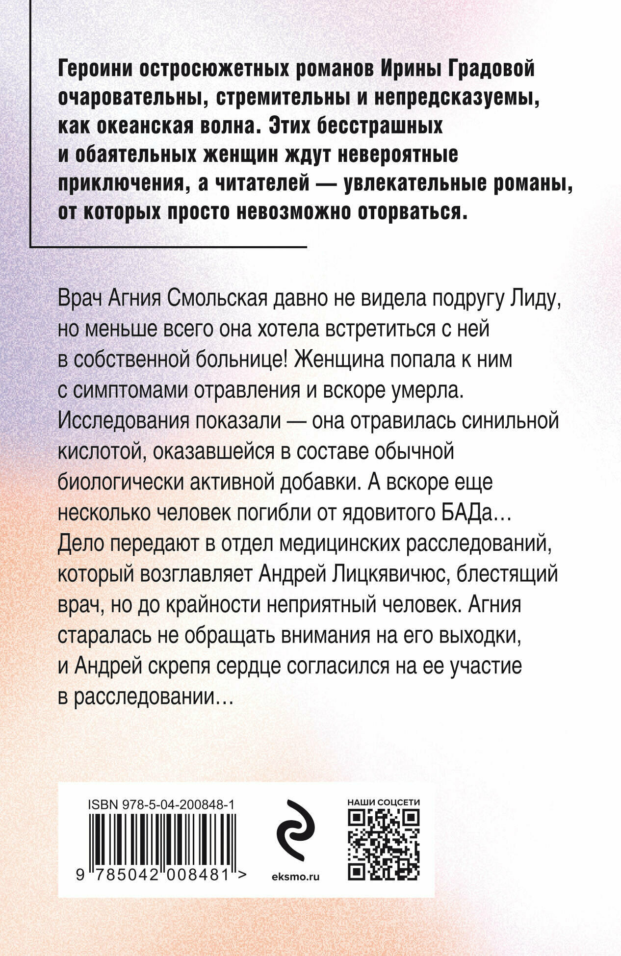 Врач Агния Смольская давно не видела подругу Лиду, но меньше всего она хотела встретиться с ней в собственной больнице! Женщина попала к ним с симптомами отправления, и вскоре умерла. Исследования показали — она отравилась синильной кислотой, оказавшейся в составе обычной биологически активной добавки. А вскоре еще несколько человек погибли от ядовитого БАДа… Дело передают в отдел медицинских расследований, который возглавляет Андрей Лицкявичюс, блестящий врач, но до крайности неприятный человек. Агния старалась не обращать внимания на его выходки, и Андрей скрепя сердце согласился на ее участие в расследовании…