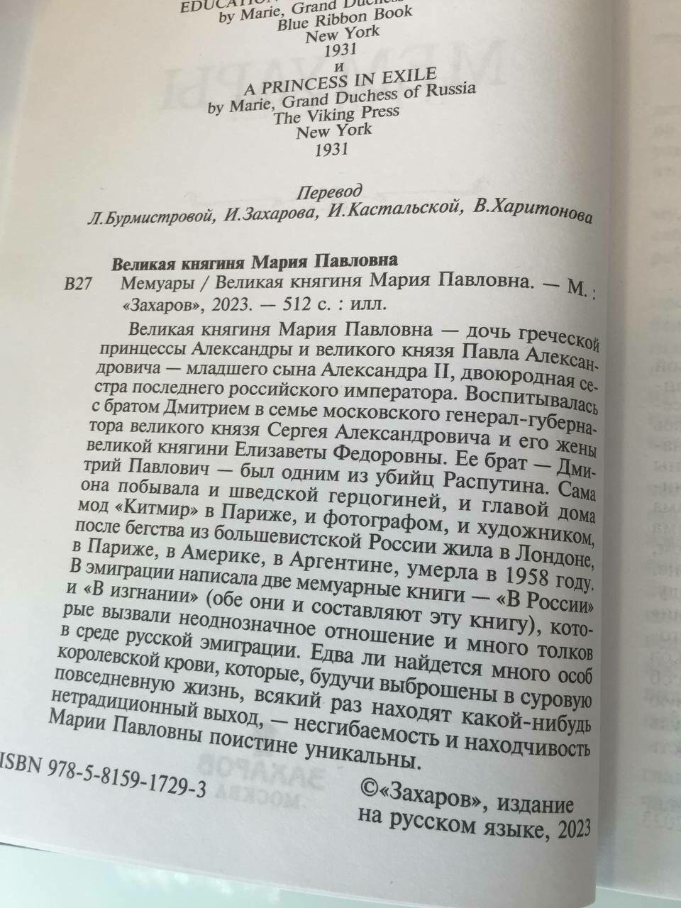 Великая княгиня Мария Павловна (1890-1958) - дочь греческой принцессы Александры и великого князя Павла Александровича - младшего сына Александра III, двоюродная сестра последнего российского императора. Воспитывалась с братом Дмитрием в семье московского генерал-губернатора великого князя Сергея Александровича и его жены великой княгини Елизаветы Федоровны. Ее брат - Дмитрий Павлович - был одним из убийц Распутина. Сама она побывала и шведской герцогиней, и главой дома мод "Китмир" в Париже, и фотографом, и художником, после бегства из большевистской России жила в Лондоне, в Париже, в Америке, в Аргентине, умерла в 1958 году. В эмиграции написала две мемуарные книги - "В России" и "В изгнании" (обе они и составляют эту книгу), которые вызвали неоднозначное отношение и много толков в среде русской эмиграции. Едва ли найдется много особ королевской крови, которые, будучи выброшены в суровую повседневную жизнь, всякий раз находят какой-нибудь нетрадиционный выход, - несгибаемость и находчивость Марии Павловны поистине уникальны.