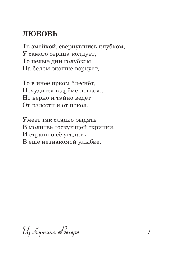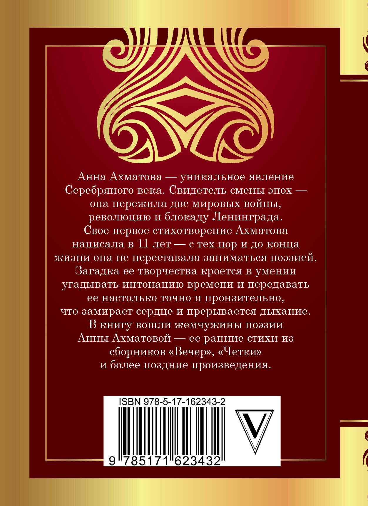 Анна Ахматова — уникальное явление Серебряного века. Свидетель смены эпох — она пережила две мировые войны, революцию и блокаду Ленинграда. Свое первое стихотворение Ахматова написала в 11 лет — с тех пор и до конца жизни она не переставала заниматься поэзией. Загадка ее творчества кроется в умении угадывать интонацию времени и передавать ее настолько точно и пронзительно, что замирает сердце и прерывается дыхание. В книгу вошли жемчужины поэзии Анны Ахматовой — ее ранние стихи из сборников «Вечер», «Четки» и более поздние зрелые произведения.