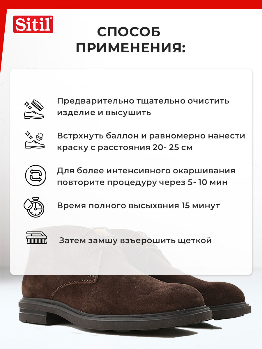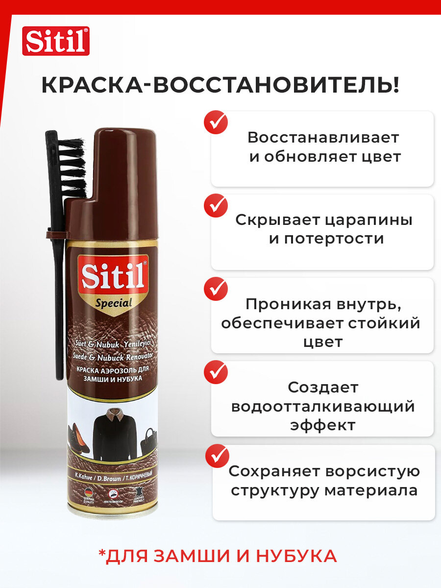 Быстро и эффективно восстанавливает цвет обуви, одежды и аксессуаров из замши, велюра и нубука, не склеивая ворс. Сохраняет бархатистость замши, обладает водоотталкивающим эффектом. Цвета: бесцветный, темно-коричневый, черный.