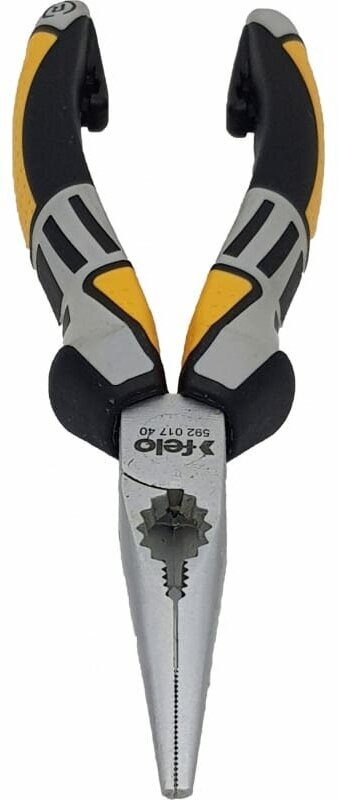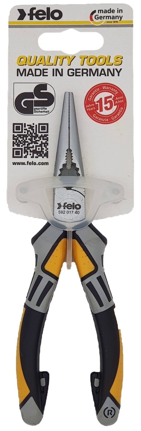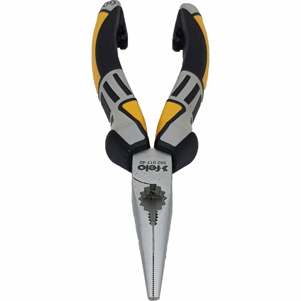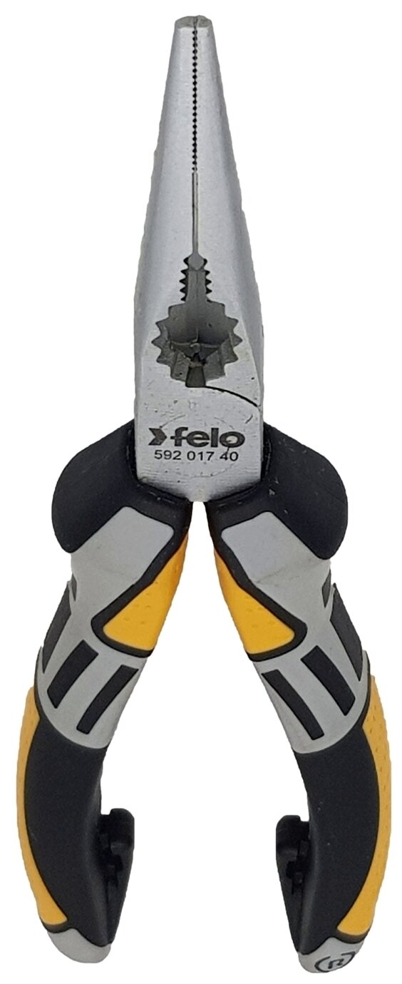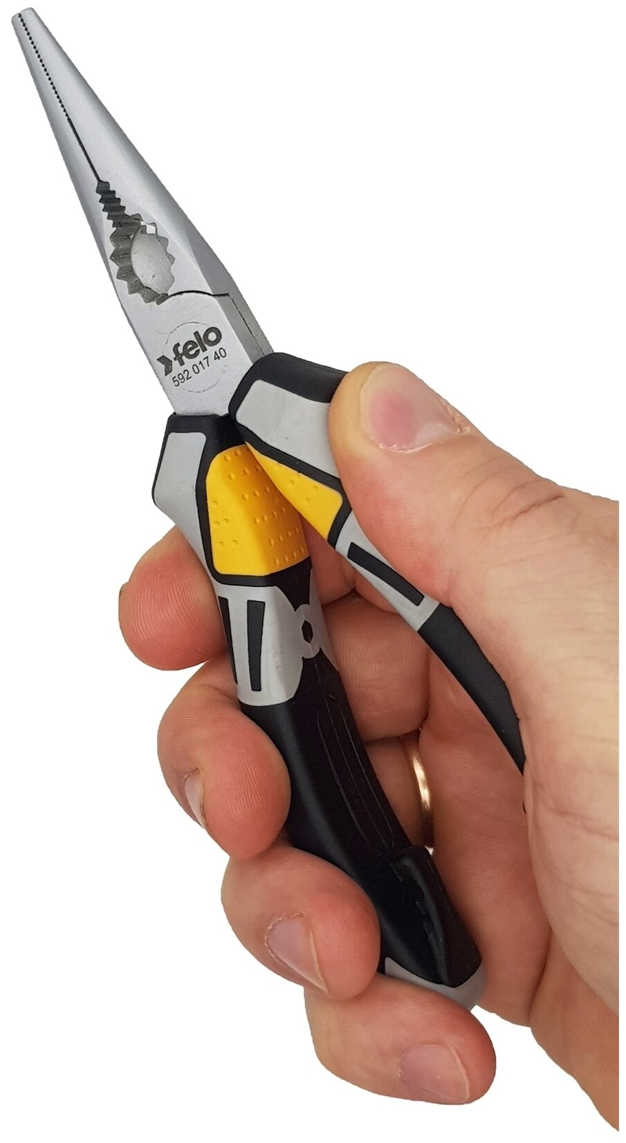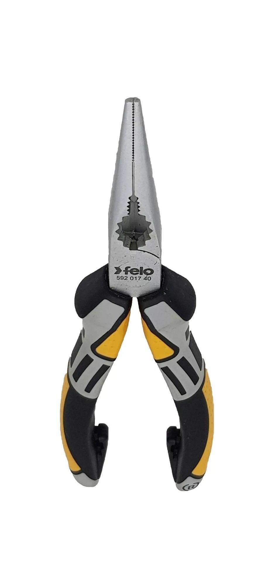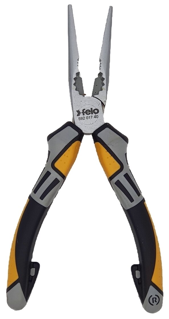 Длинногубцы Felo 170 мм широко используется в местах с ограниченным пространством и предназначены для захвата, удержания, загибания или скручивания различных предметов, проводов при выполнении слесарных или иных видов работ. От проскальзывания служат зубчики на поверхности губок. Губки изготовлены из высокопрочной легированной стали CrMoV (хром-молибден-ванадий) и закалены до твердости 60-64 HRC. Инструмент оснащен двухкомпонентными рукоятками со специальными упорами для безопасного хвата и противоскользящими характеристиками, благодаря чему инструмент удобно лежит в руке во время работы и не выскальзывает. Материал ручек устойчив к воздействию агрессивных сред и ГСМ. Инструмент идеально подходит как для бытового, так и для ежедневного профессионального использования, выдерживает высокие нагрузки