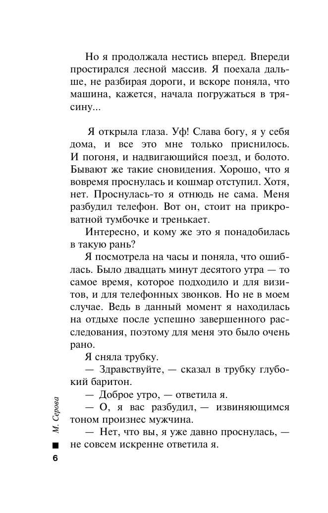Частный сыщик Татьяна Иванова расследует смерть музыкального продюсера Константина. Он был застрелен за городом, при нем была обнаружена некоторая сумма денег, дорогие часы и золотая перчатка. Кому и зачем понадобилось убивать Константина? Чем больше Татьяна общается со знакомыми убитого, тем запутаннее становится дело. По рассказам, он был настолько ужасным человеком, чудовищем, просто зверем, что тот, кто лишил его жизни, совершил хорошее дело. Вот только Ивановой все равно нужно завершить расследование до конца и найти преступника. Марина Серова - феномен современного отечественного детективного жанра. Выпускница юрфака МГУ, работала в Генеральной прокуратуре. Участвовала в боевых операциях и оперативных мероприятиях. Автор ряда остросюжетных повестей, суммарный тираж которых превышает двадцать миллионов экземпляров.