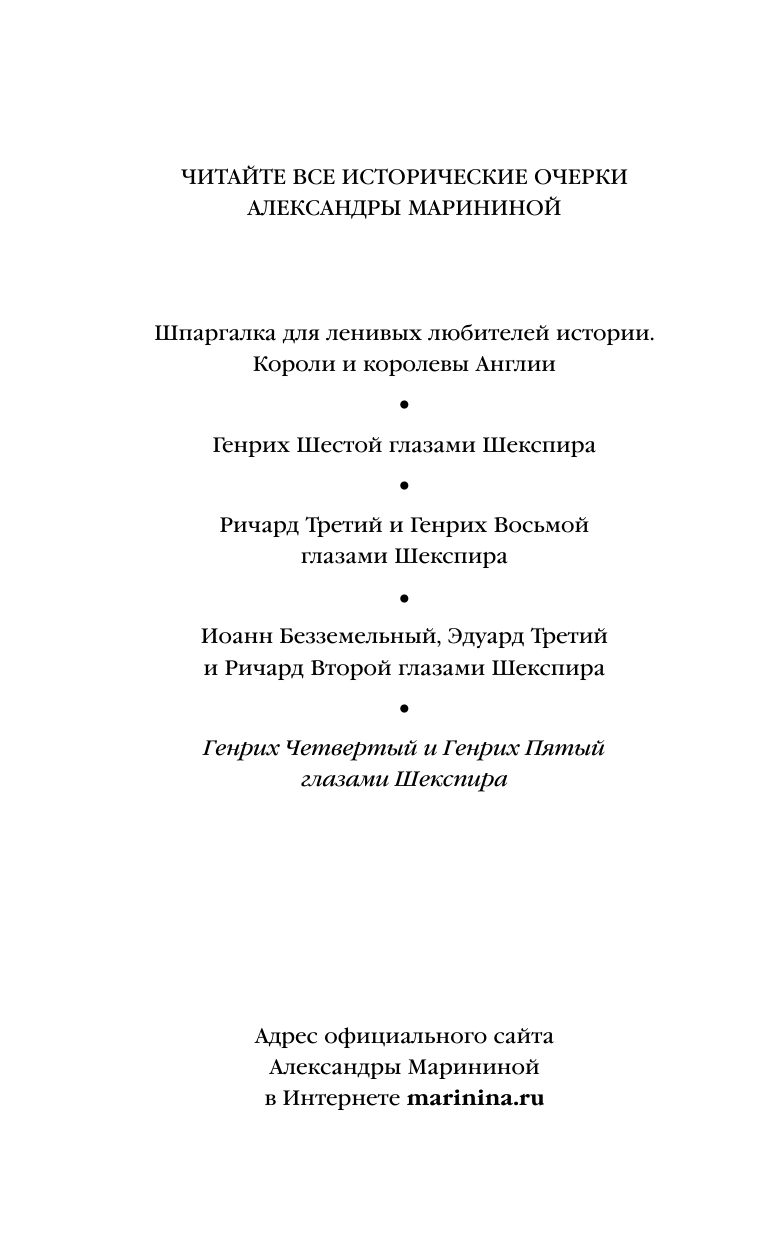 Он мечтал изменить историю победами и завоеваниями, а изменил ее — своей смертью. Юный принц Генрих ведет беспутный образ жизни вместе с весельчаком Фальстафом и другими приятелями. Но вот его отец, Генрих Четвертый, умирает. И новый король, Генрих Пятый, неожиданно для многих крепко хватается за власть. Он верит: Бог и Англия ждут от него завоевания Франции, а заодно — руки и сердца французской принцессы Екатерины, дочери Безумного Короля... "Если счесть пороком — желать без меры славы, то, клянусь, Я самый страшный грешник!"Александра Маринина предлагает увлекательное историческое расследование, почему правители торжествуют на полях сражений, но проигрывают собственным демонам. Главным свидетелем и экспертом выступает гениальный Уильям Шекспир.