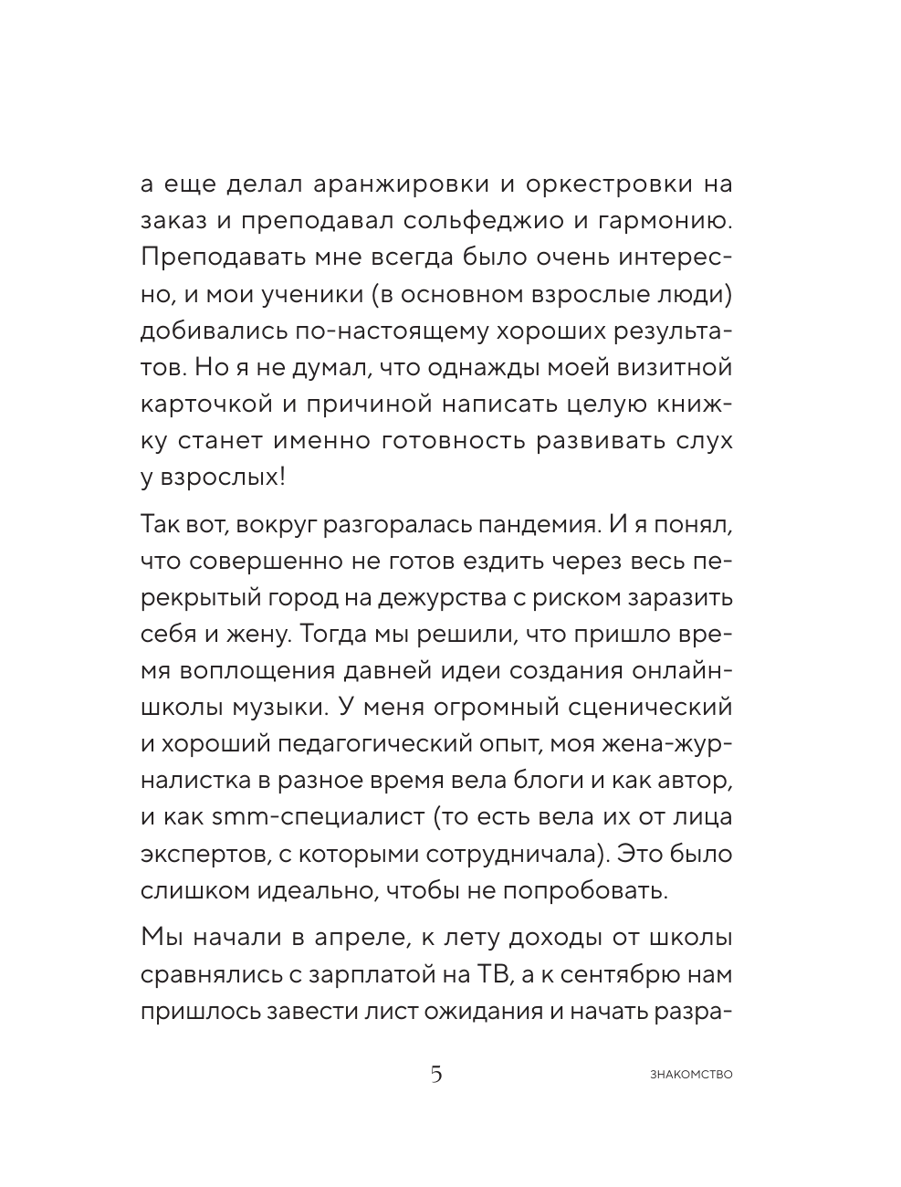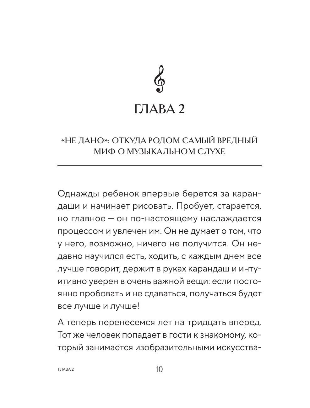 Узнайте как развивать в себе музыкальных слух и как учиться сольфеджио самостоятельно! Автор книги, блогер Влад Елистратов, объясняет, что слух это всего лишь навык, и при определенном подходе его можно развивать в себе самостоятельно. С помощью авторских упражнений и специально подобранных под них плейлистов читатели смогут прокачать свои умения и открыть в себе новые таланты: слушайте музыку и воспроизводите ноты на инструменте!