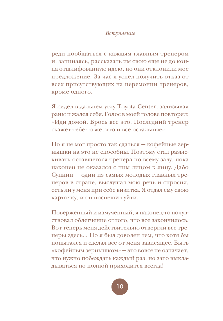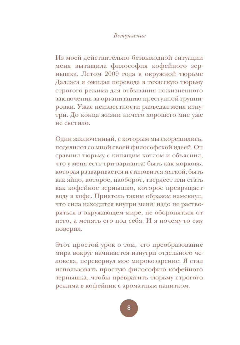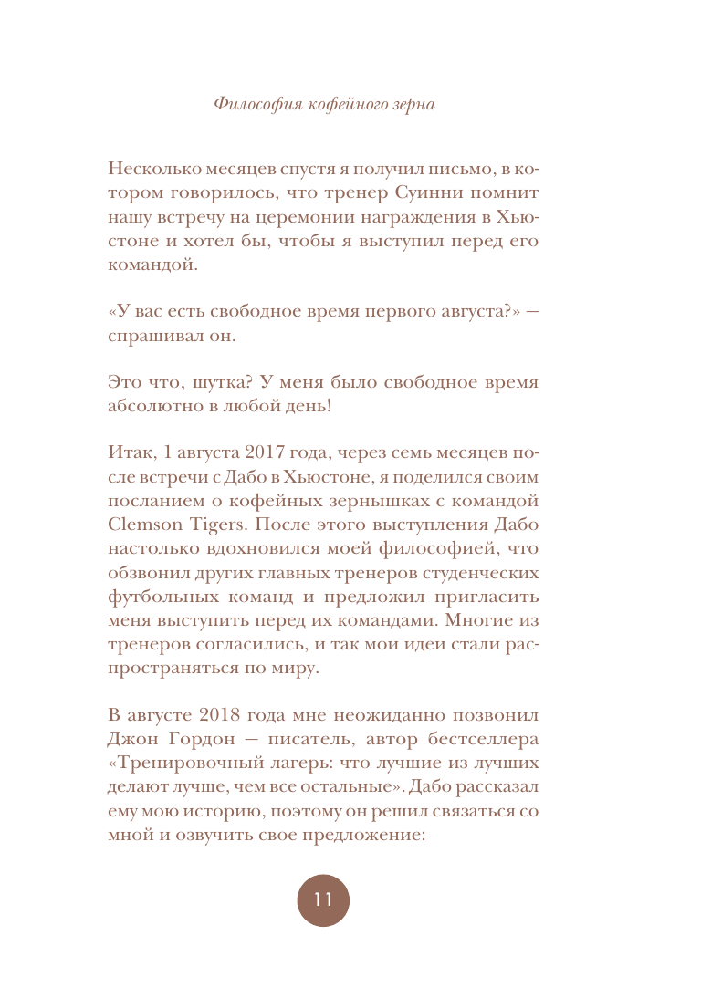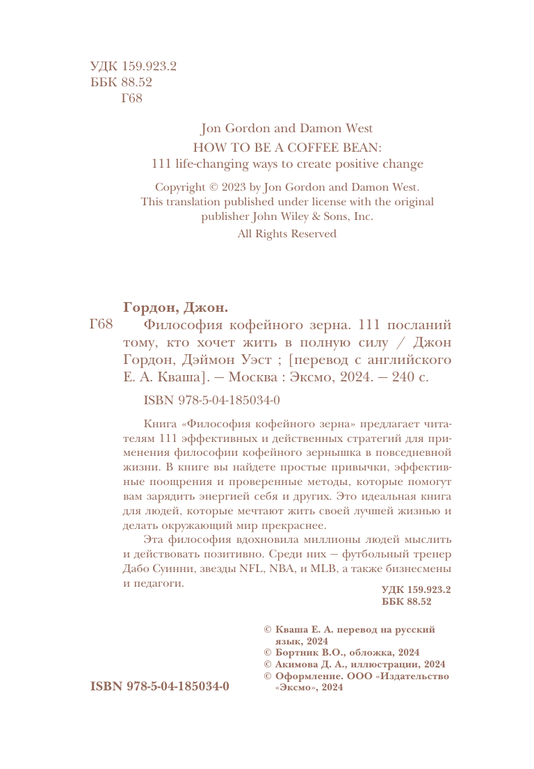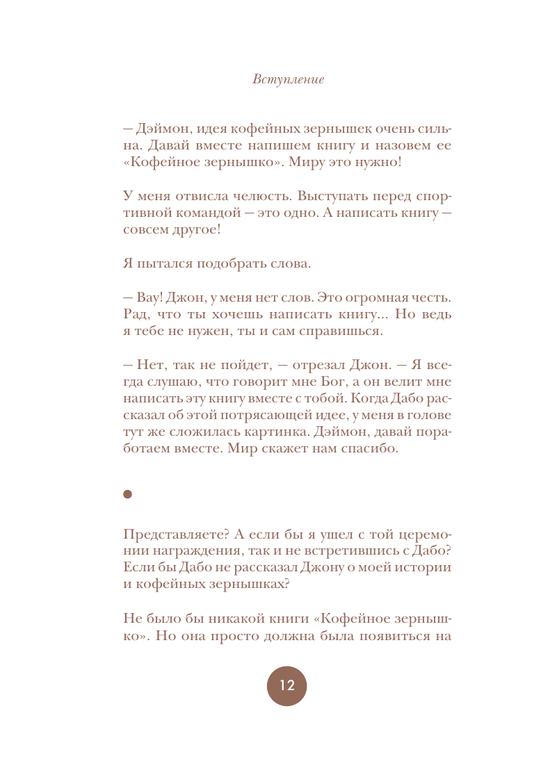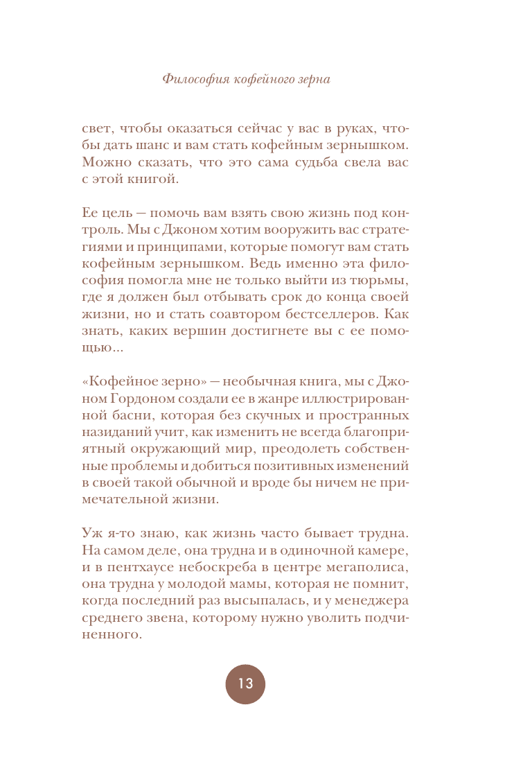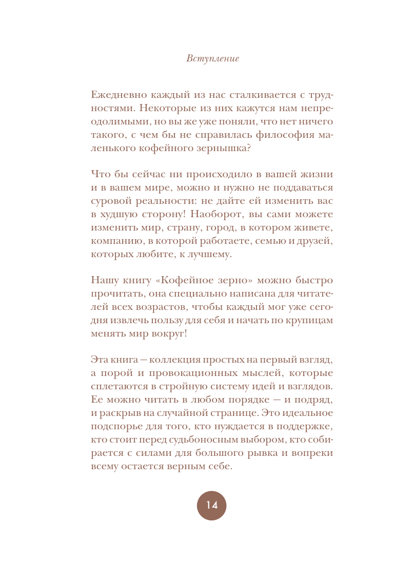 Книга "Философия кофейного зернышка" предлагает читателям 111 эффективных и действенных стратегий для применения философии кофейного зернышка в повседневной жизни. В книге вы найдете простые привычки, эффективные поощрения и проверенные методы, которые помогут вам зарядить энергией себя и других. "Как быть кофейным зернышком" — это идеальная книга для людей, которые мечтают жить своей лучшей жизнью и делать окружающий мир прекраснее. Эта философия вдохновила миллионы людей мыслить и действовать позитивно. Среди них — футбольный тренер Дабо Суинни, звезды NFL, NBA, и MLB, а также бизнесмены и педагоги.