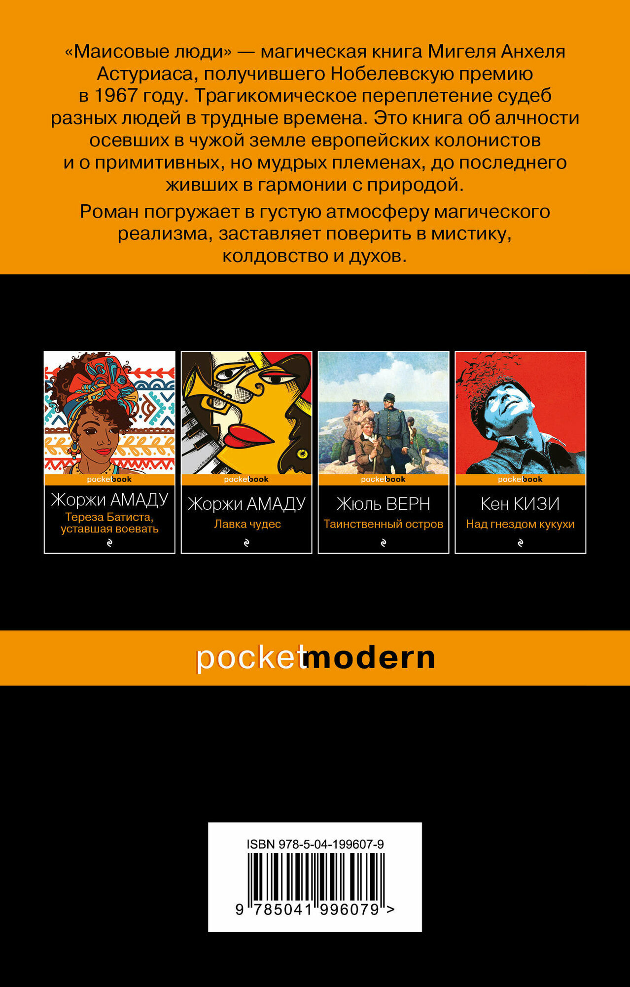 ХХ век - "звездный час" латиноамериканской литературы. Началом новой латиноамериканской прозы принято считать 1949 год. Именно тогда появились первые "магические книги" - "Маисовые люди" Астуриаса и повесть "Царство Земное" Алехо Карпентьера. "В них живет внутреняя энергия поэтического слова" - так говорил Мигель Анхель Астуриас о романах латиноамериканских авторов. "Маисовые люди" захватывают читателя в плен с первых слов, погружают в густую атмосферу магического реализма. События превращаются в легенды, в которых вовек не отличишь правду от лжи, а реальность от вымысла. Сюжет книги прост. Гаспар Илом, которого охраняют кролики с ушами из листьев маиса, сговорился с индейцами, чтобы помешать жадным торговцам вырубить и выжечь лес недалеко от деревни Писигуилито. Многие алчные отправились на тот свет от его руки, а затем Мачохан, индеец, которого жена-испанка переделала на свой лад, купил яд и отравил Гаспара. Но нельзя просто так убить человека, если его охраняют жёлтые кролики, для которых нет ни тайн, ни угроз, ни расстояний. Борьба продолжается. Новая глава начинает новую историю о самых разных людях: о страдающей от проклятий семье, о прозревшем слепом, ищущем сбежавшую жену, о почтальоне, оборачивающемся койотом. Действие охватывает и деревни и города. Автор показывает жизнь как она есть, удивляясь всякому ее проявлению, от лесных зверей до мудрых шаманов, от маисовых полей до ураганов в горных ущельях. Все это его мир, его страна, его родина. В "Маисовых людях" - дух Гватемалы, история, которой не найти в справочниках и энциклопедиях. Если Вы интересуетесь культурой Южной Америки и не равнодушны к жанру магический реализм, не проходите мимо. Это один из лучших образцов латиноамериканской литературы от гениального писателя, получившего Нобелевскую премию в 1967 году.