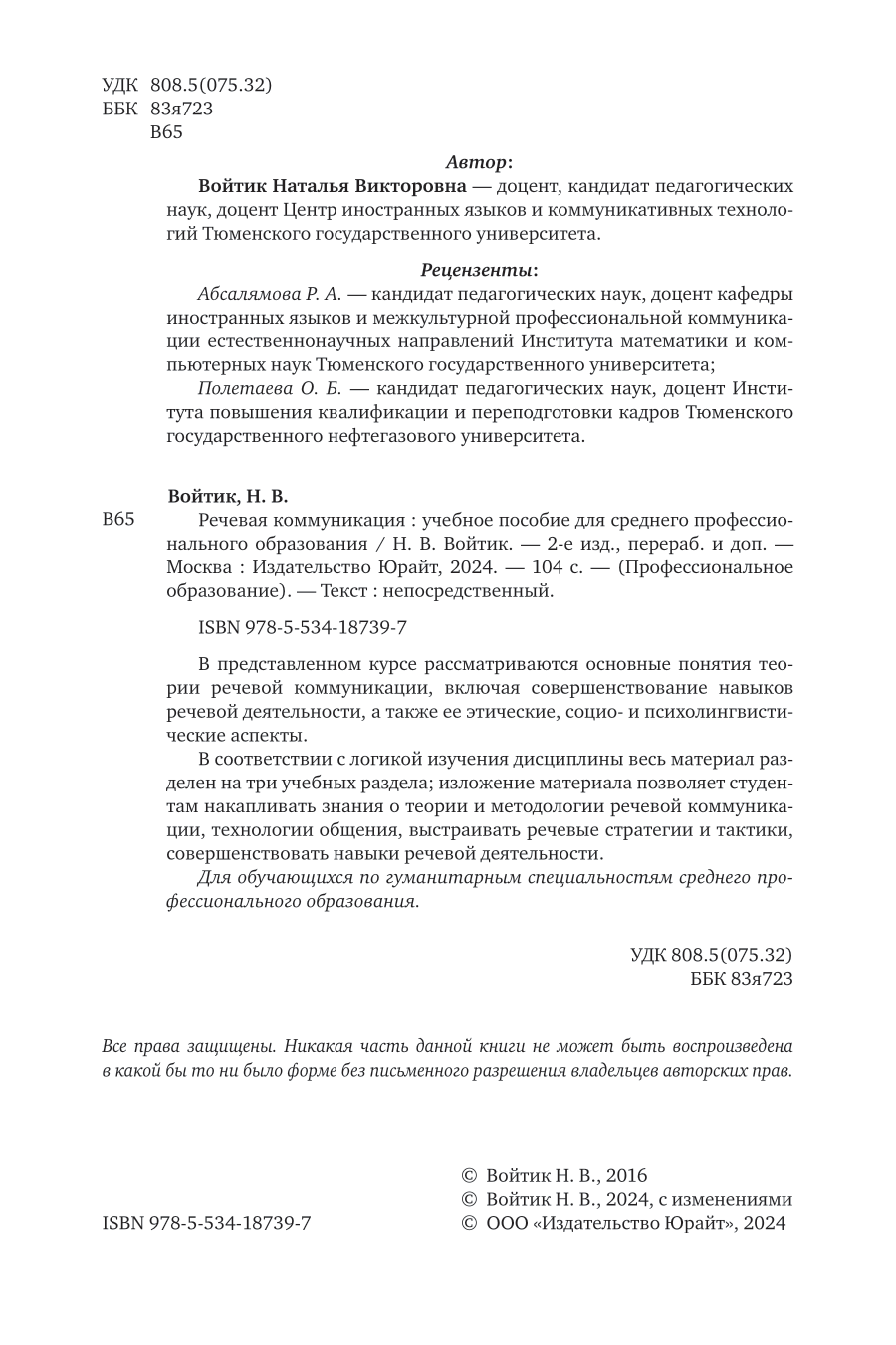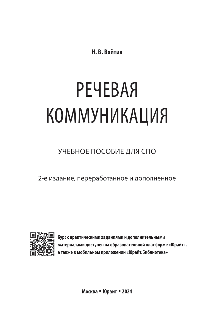 Речевая коммуникация 2-е изд. пер. и доп. Учебное пособие для СПО (Наталья Викторовна Войтик); ЮРАЙТ, 2024