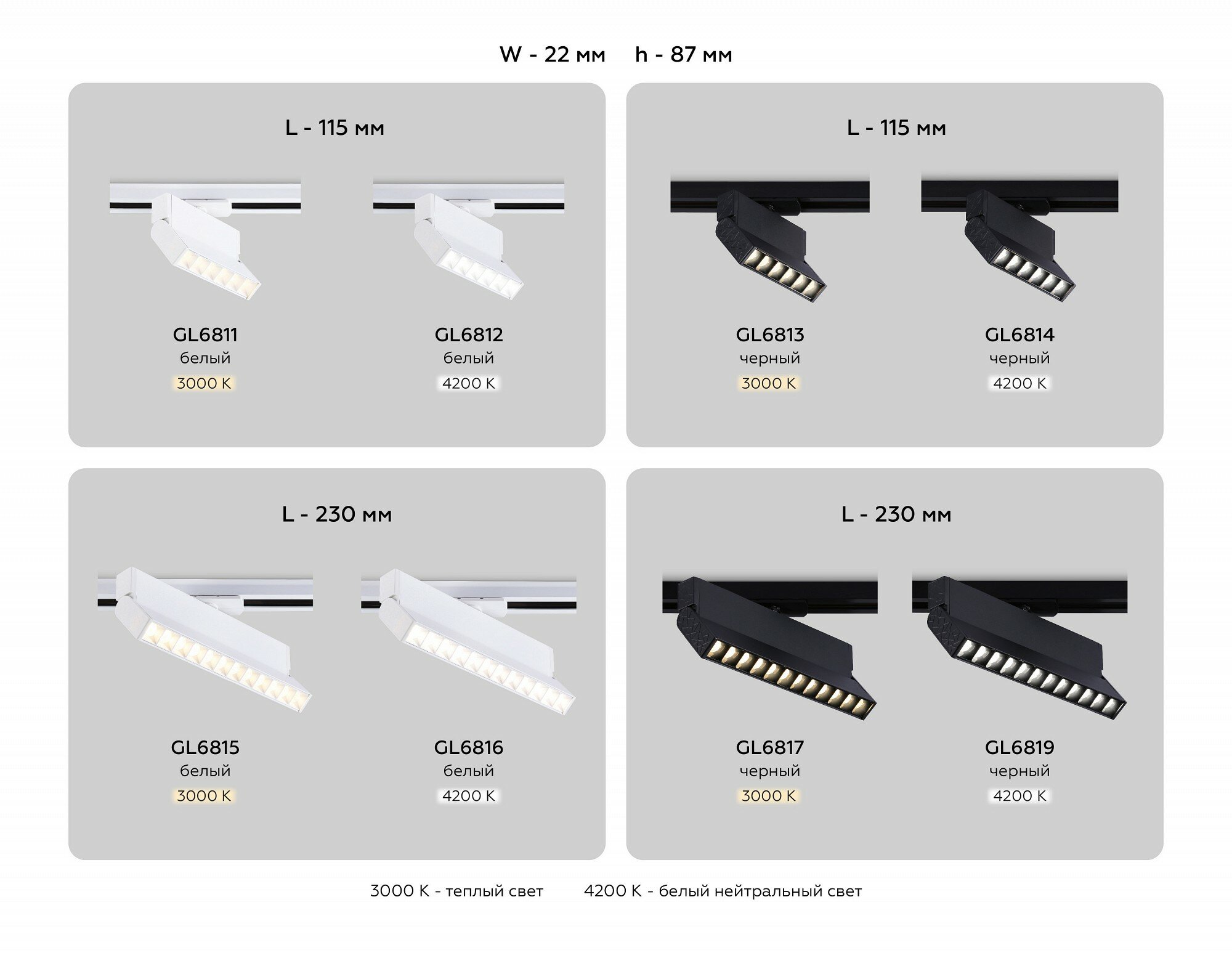 | Номенклатура | GL6815 WH белый LED 12W 3000K 24° 230*22*87 |