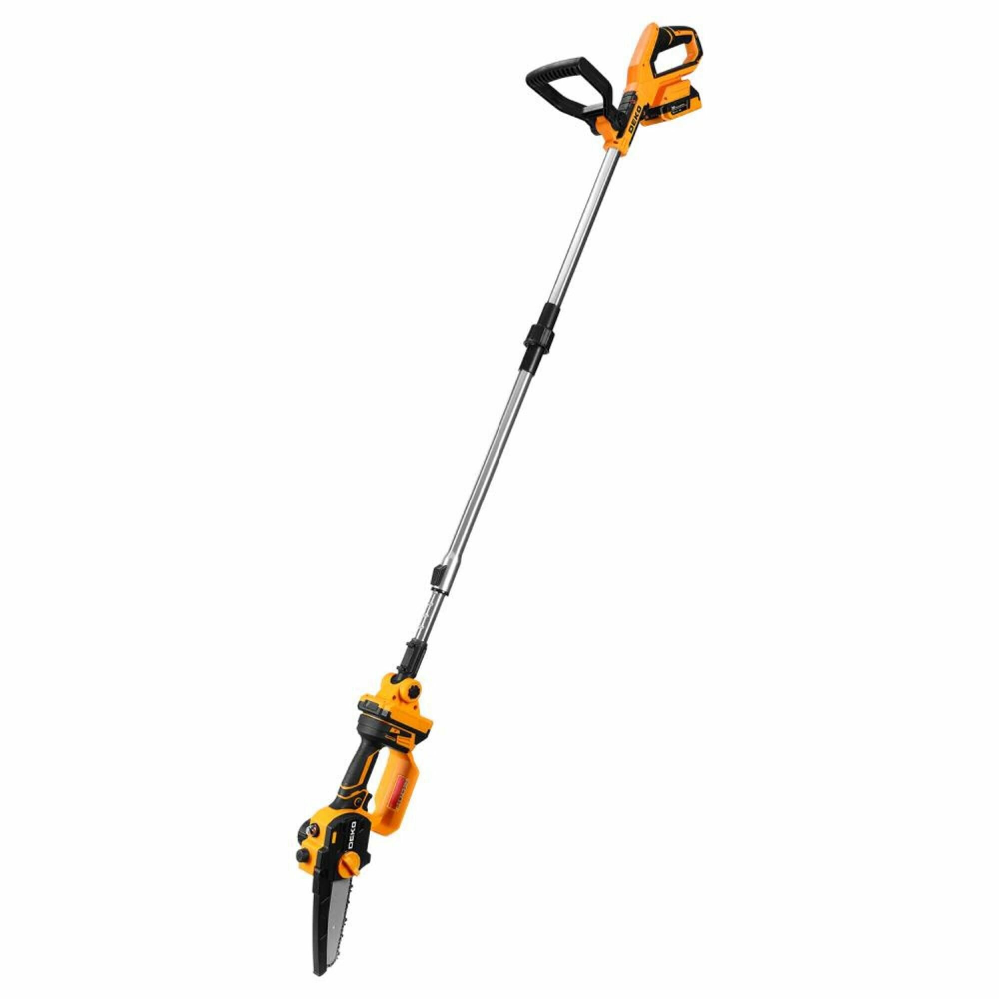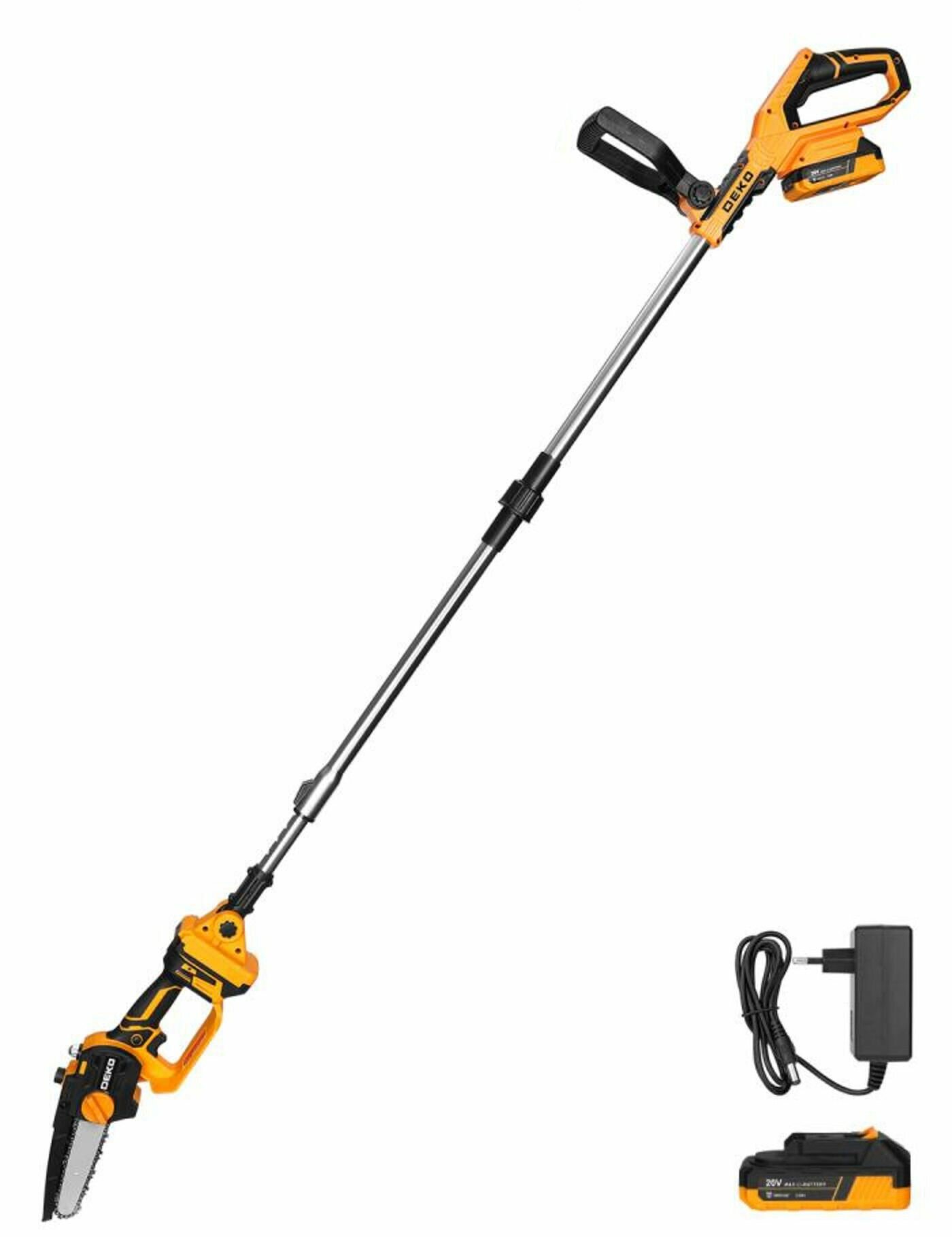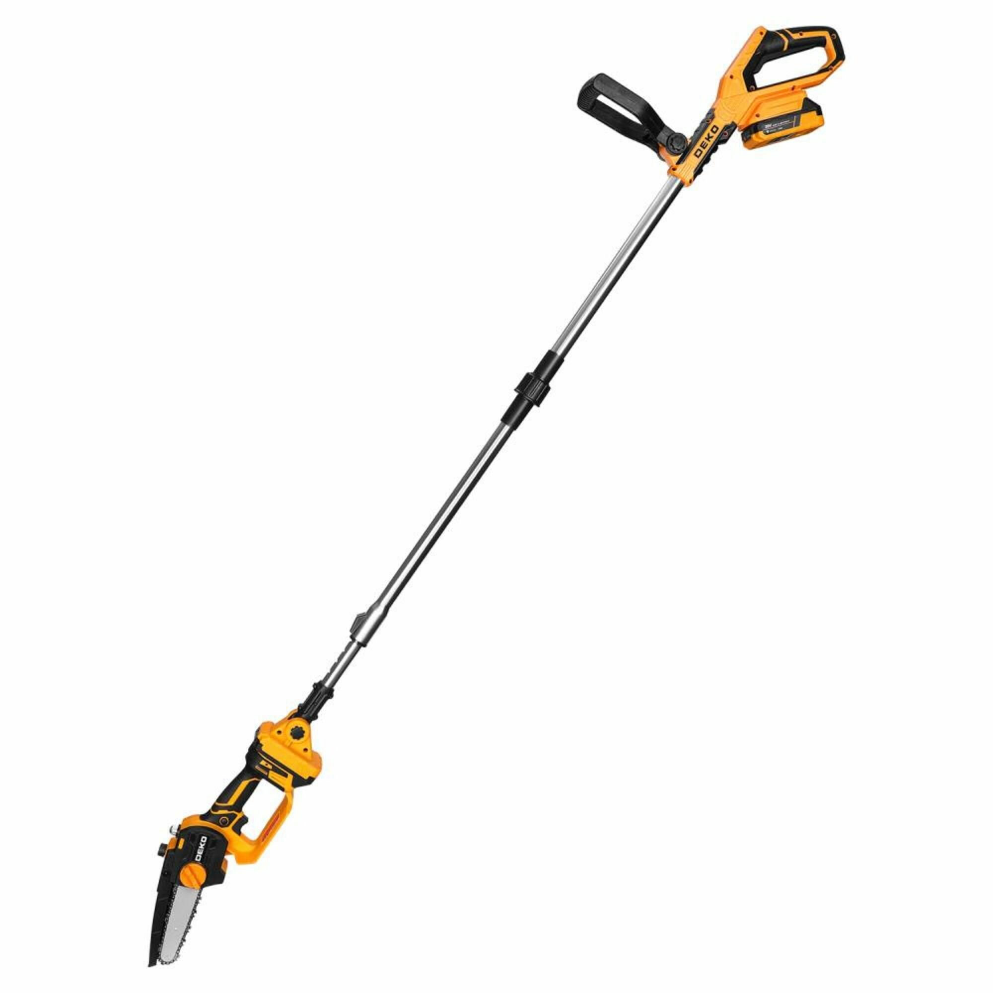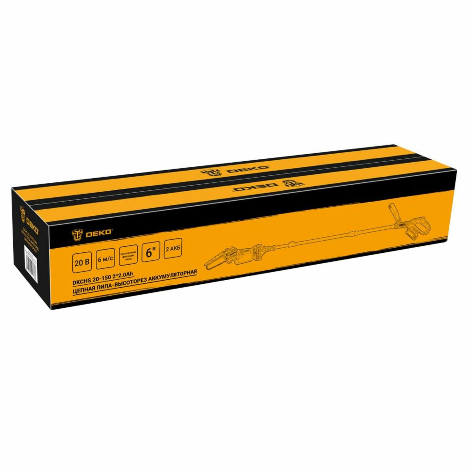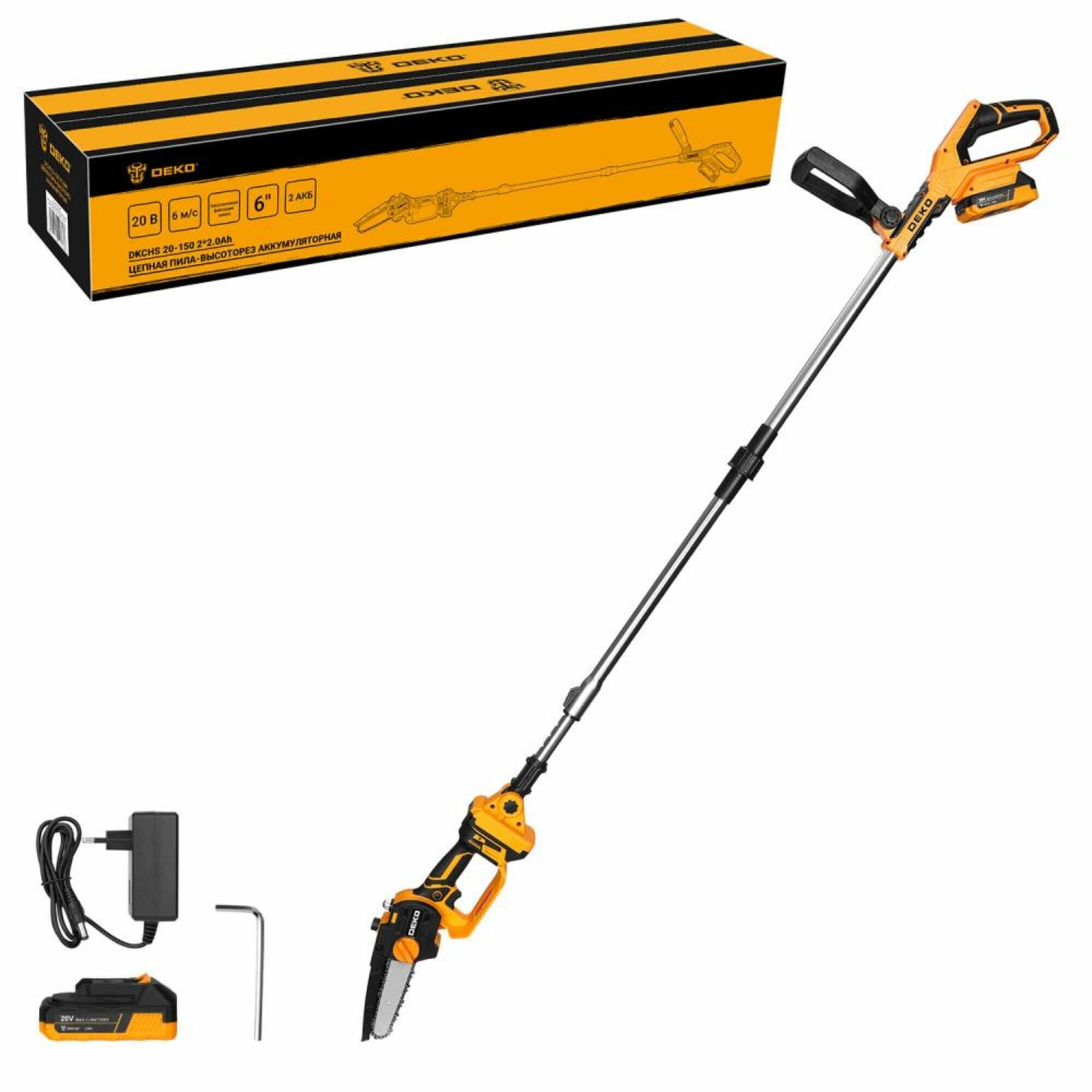 **Пила-высоторез аккумуляторная Deko DKCHS20-150** идеально подходит для обрезки сучьев и тонких веток, расположенных на значительной высоте. Это настоящий помощник на любом садовом или дачном участке, с помощью которого можно не только удалить старые побеги, но и придать деревьям или высоким кустарникам красивую форму — какие-либо дополнительные средства подъема не потребуются. Удобная рукоятка обеспечивает надежный хват и улучшает контроль над инструментом. Устройство не требует подключения к розетке — источником питания служит литий-ионная аккумуляторная батарея с высокой плотностью энергии. Главное — своевременно подзаряжать АКБ. Так как штанга пилы складывается за счет телескопической конструкции, то проблем с ее хранением не возникает.