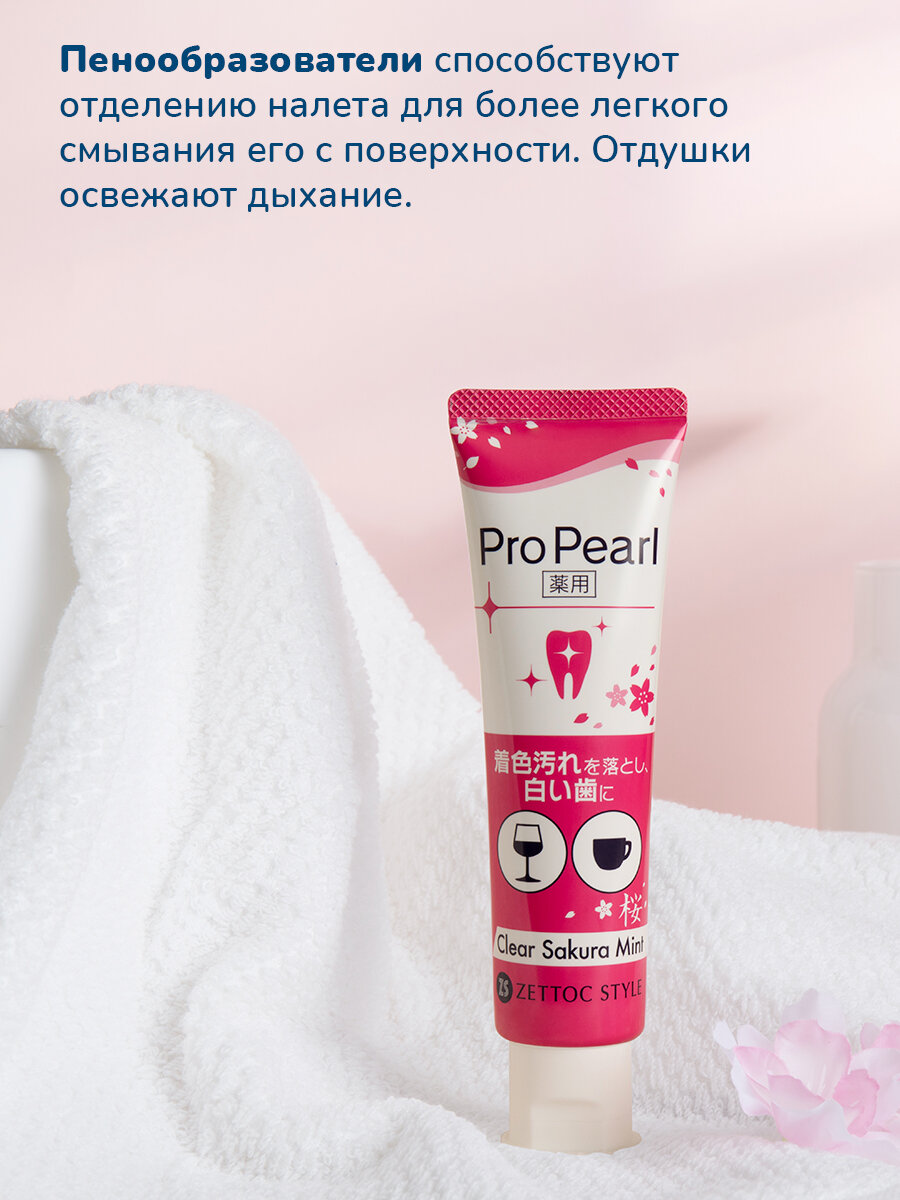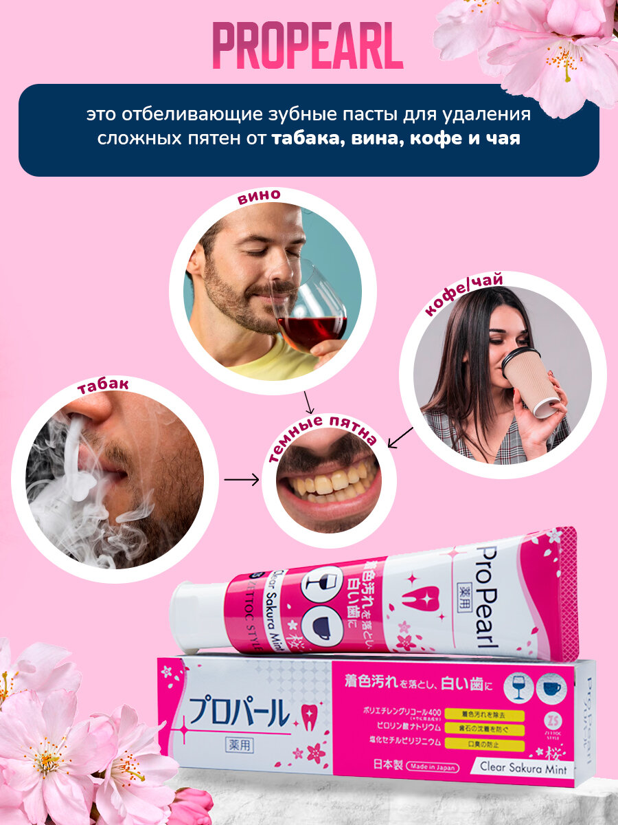 Propearl — японская отбеливающая зубная паста без фтора, специально разработанная для удаления стойких пятен, сделает ваши зубы блестящими, а дыхание свежим. Сигареты, кофе и вино вызывают появление пятен, которые накапливаются каждый день.Чтобы удалить стойкие пятна, нужно использовать отбеливающую зубную пасту. Пенообразователи способствуют отделению налета для более легкого смывания его с поверхности. Отдушка с ароматом сакуры-мяты освежают дыхание. Отсутствие бактерий и налета влияет положительно на профилактику гингивита, кариеса и запаха изо рта, предотвращает появление новых пятен.активные компоненты И преимущества- полиэтиленгликоль (PEG8) — размягчает налет и заставляет его отделяться от поверхности, под воздействием мелких частиц кремнезема (Silica) удаляются стойкие пятна, в том числе в промежутках между зубами.- пирофосфаты — смывают налет с поверхности и предотвращают появление новых пятен.- хлорид цетилпиридиния — убивает бактерии и другие микроорганизмы, действуя как антисептик.