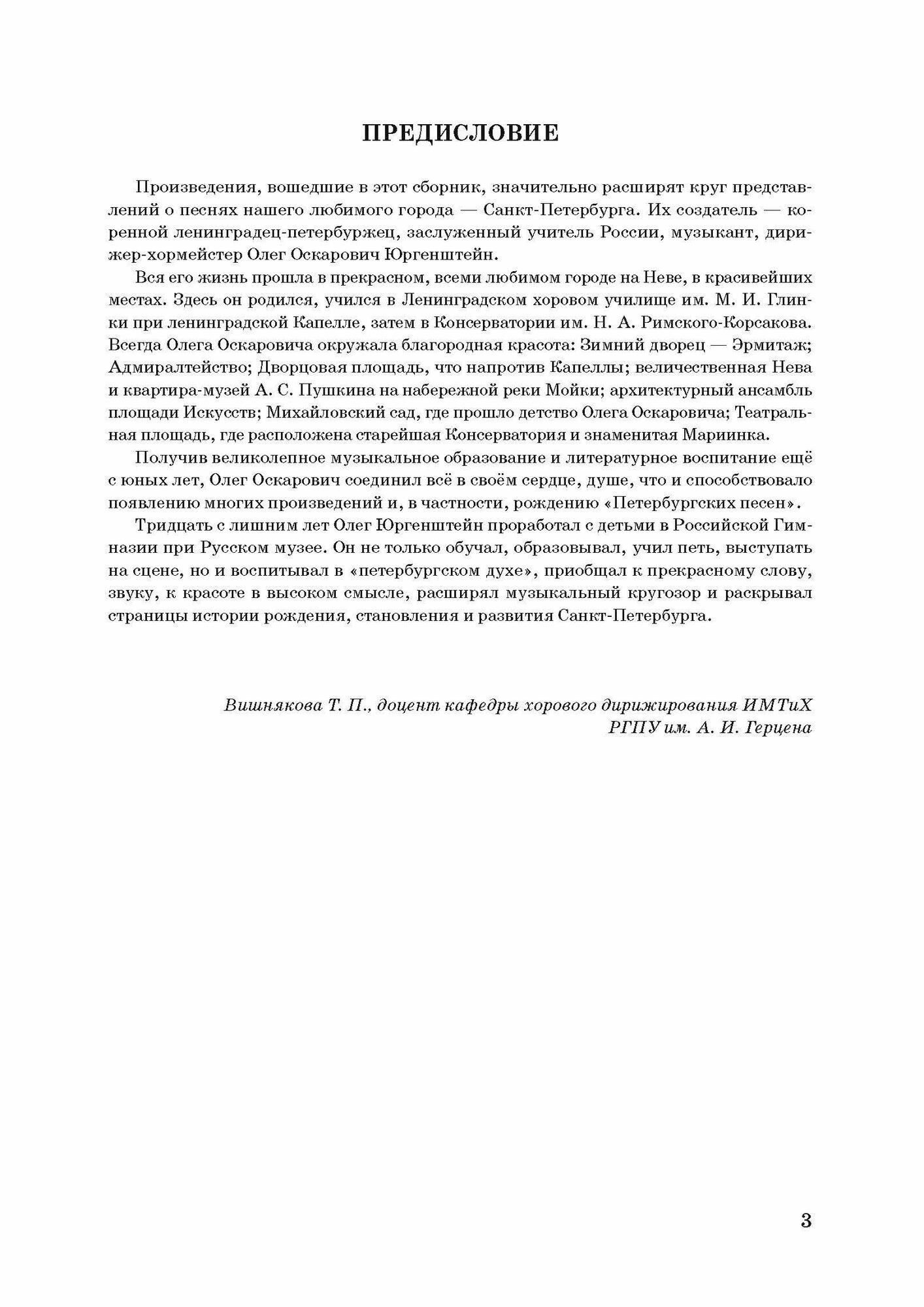 Сочинения, представленные в сборнике, написаны заслуженным учителем России, петербургским музыкантом, дирижером-хормейстером Олегом Оскаровичем Юргенштейном. Каждая песня посвящена любимому Санкт-Петербургу и многогранно раскрывает его историю и красоты: величие Невы, дворцов и площадей, белых ночей и утренних рассветов. Произведения могут использоваться в учебно-просветительской и концертной деятельности хоровых коллективов разной возрастной категории, а также музыкантами-хормейстерами в педагогической практике.
