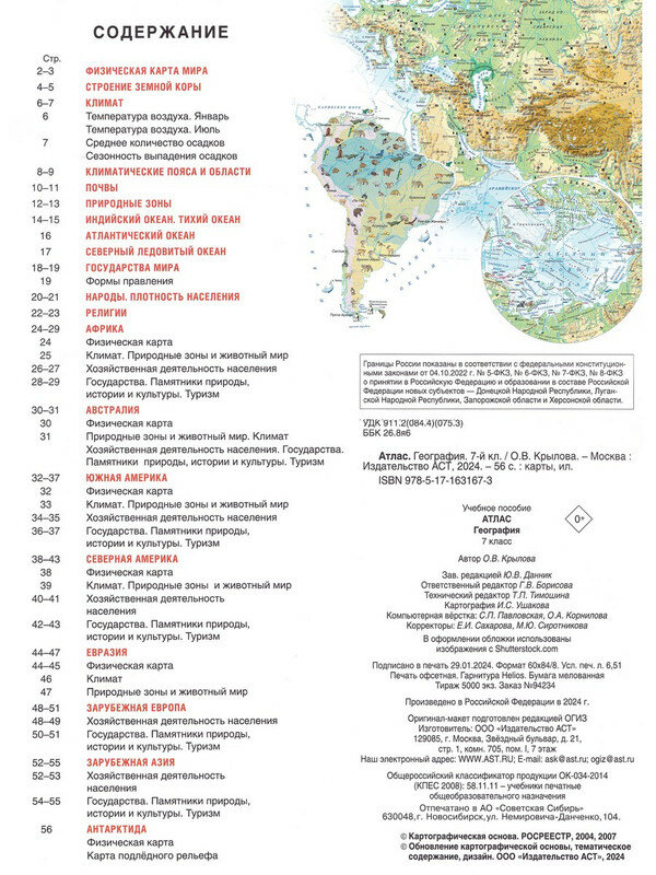 Атлас по географии для 7-го класса (автор – О.В. Крылова) разработан в соответствии с "Концепцией развития географического образования в Российской Федерации" и направлен на овладение учащимися универсальными учебными действиями, в том числе познавательными. Изучение материалов атласа существенно расширит объём познаний учащихся о природе и населении Земли, о географических особенностях материков и океанов. В данном атласе большое внимание уделяется проверке навыков работы с различными видами и источниками географической информации. Атласт подходит ко всем школьным программам и учебникам по географии, соответствует требованиям ФГОС и одобрен методистами. Россия в атласе представлена в новых границах: с Донецкой и Луганской народными республиками, Запорожской и Херсонской областями, Республикой Крым и Севастополем.