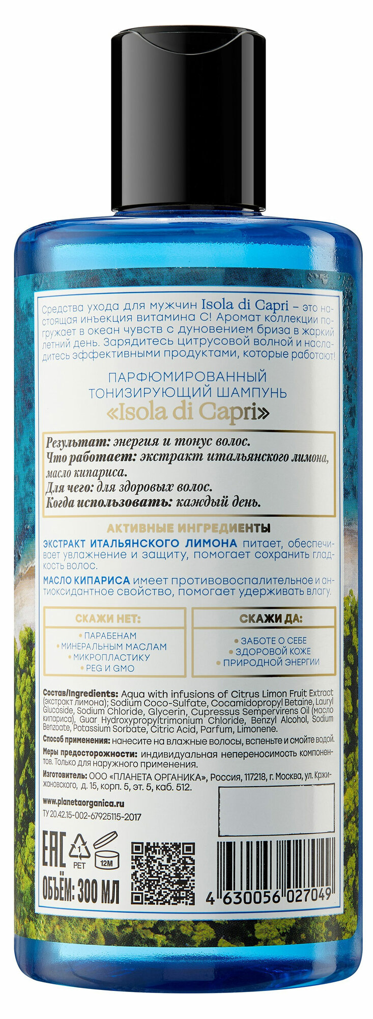 Средства ухода для мужчин Isola di Capri это настоящая инъекция витамина С! Аромат коллекции погружает в океан чувств с дуновением бриза в жаркий летний день. Зарядитесь цитрусовой волной и насладитесь эффективными продуктами, которые работают! ПАРФЮМИРОВАННЫЙ ТОНИЗИРУЮЩИЙ ШАМПУНЬ Isola di Capri Результат: энергия и тонус волос. Что работает: экстракт итальянского лимона, масло кипариса. Для чего: для здоровых волос. Когда использовать: каждый день. АКТИВНЫЕ ИНГРЕДИЕНТЫ ЭКСТРАКТ ИТАЛЬЯНСКОГО ЛИМОНА питает, обеспечивает увлажнение и защиту, помогает сохранить гладкость волос. МАСЛО КИПАРИСА имеет противовоспалительное и антиоксидантное свойство, помогает удерживать влагу. СКАЖИ НЕТ: - ПАРАБЕНАМ - МИНЕРАЛЬНЫМ МАСЛАМ - МИКРОПЛАСТИКУ - PEG И GMO СКАЖИ ДА: - ЗАБОТЕ О СЕБЕ - ЗДОРОВОЙ КОЖЕ - ПРИРОДНОЙ ЭНЕРГИИ