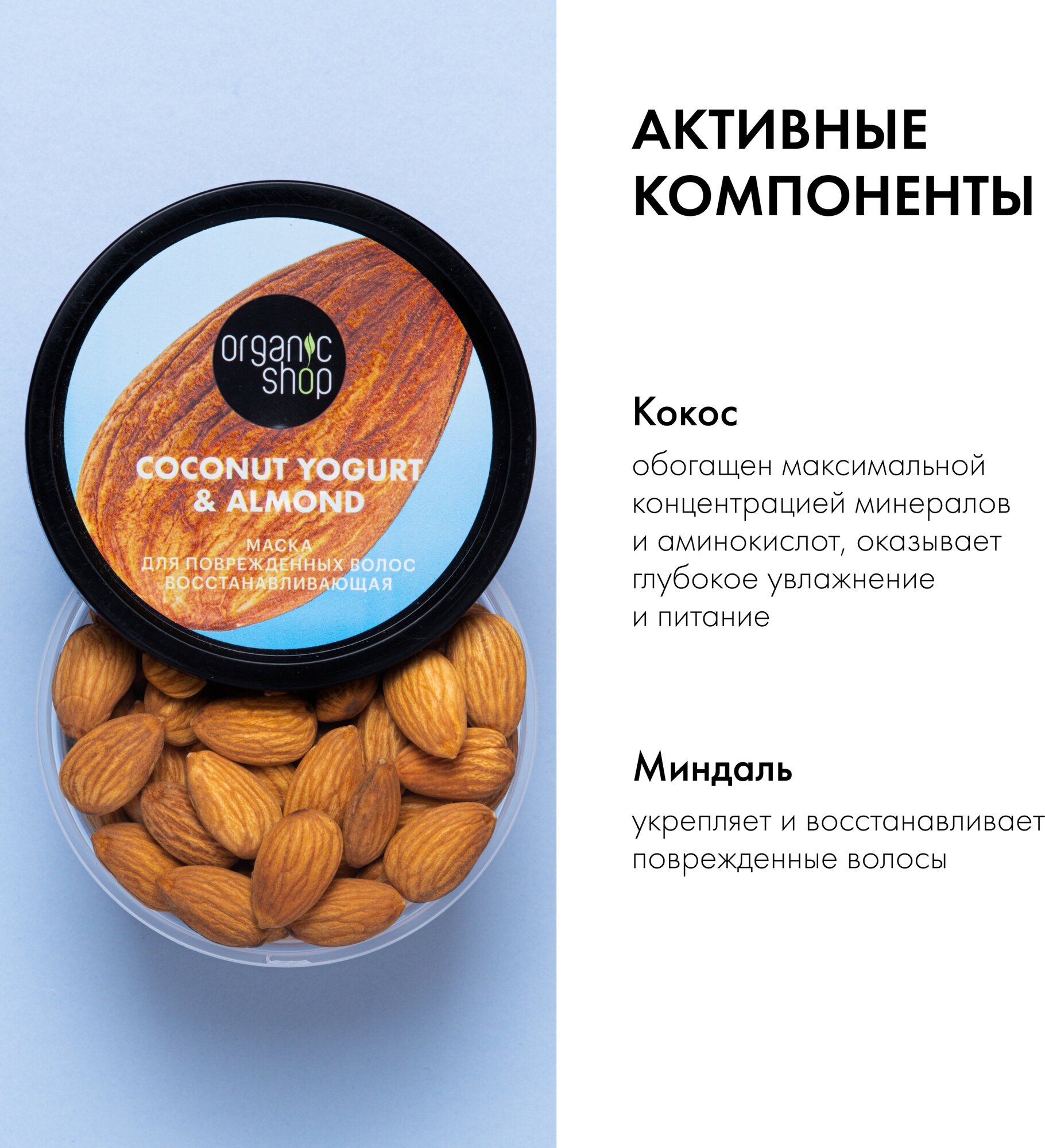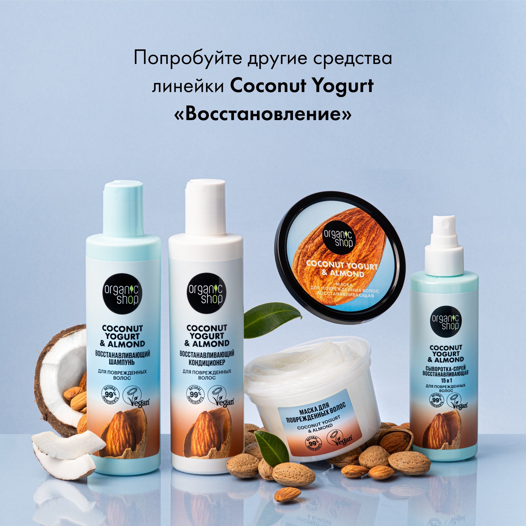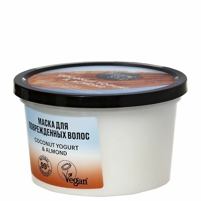 Маска для поврежденных волос Восстанавливающая проникает глубоко в структуру волоса, восстанавливает изнутри и снаружи, устраняя повреждения и облегчая расчесывание. Кокосовый йогурт и органическое масло сладкого миндаля укрепляют, глубоко увлажняют и возвращают волосам эластичность, не утяжеляя их.