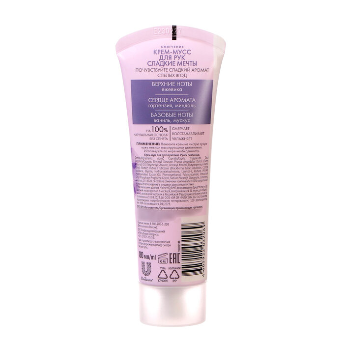 Крем-мусс для рук Бархатные Ручки Смягчение парфюмированный крем с соком сладкой ежевики и нотами гортензии 80 мл Сладкие мечты