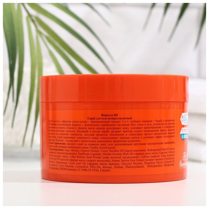 Скраб для тела с эффектом тепло-холод инновационный продукт 2 в 1: глубокое очищение + борьба с целлюлитом. Уникальная мультиактивная формула с деликатными скрабящими частицами бьет точно в цель, воздействуя на причины появления целлюлита. Кофеин и эфирное масло корицы разогревают кожу, усиливают кровообращение и стимулируют обменные клеточные процессы. Входящий в состав скраба эфирное масло мяты создает охлаждающий эффект, организм реагирует на изменение температур, запуская процессы обновления и стимулируя процесс расщепления жировой прослойки. Скраб выравнивает поверхность кожи, отшелушивает мертвые клетки и усиливает эффект последующих процедур. Результат - гладкая кожа и значительное уменьшение проявления целлюлита.