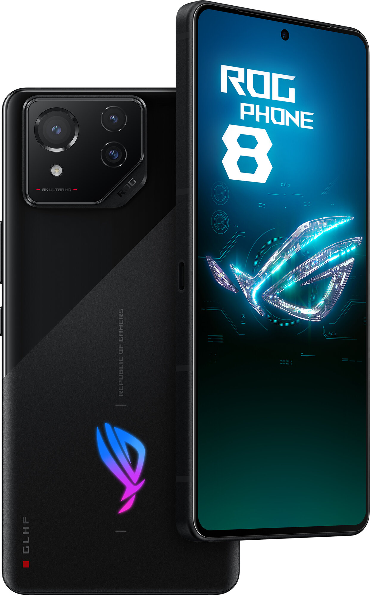 Аппаратной основой ASUS ROG Phone 8 служат однокристальная система Qualcomm Snapdragon 8 Gen 3, до 24 Гбайт ОЗУ последнего поколения LPDDR5X и встроенный накопитель UFS 4.0 объемом до 1 Тбайт. Заявлена поддержка быстрой 65-ваттной зарядной технологии HyperCharge (полная зарядка 0-100% за 39 мин) и 15-ваттной беспроводной Qi. Главная фотокамера с разрешающей способностью матрицы 50 Мп (сенсор 1/1,56″ Sony IMX890) обзавелась 6-осевой гибридной системой стабилизации Gimbal Stabilizer 3.0. Второй тыльный фотомодуль на базе 13-Мп датчика оснащен сверхширокоугольной оптикой с охватом 120 градусов. Третий сенсор в наборе тыльных камер 32-мегапиксельный, с трехкратным оптическим зумом и системой оптической стабилизации. Он поддерживает 10-кратное приближение объектов на основе алгоритмов искусственного интеллекта Hyper Clarity AI и 30-кратное программное увеличение. Фронтальная камера также 32-мегапиксельная, хотя из-за технологии объединения пикселей «4-в-1» по умолчанию снимает в 8-Мп разрешении. В ASUS утверждают, что увеличили с 73 до 90 градусов ее угол обзора для улучшения групповых селфи