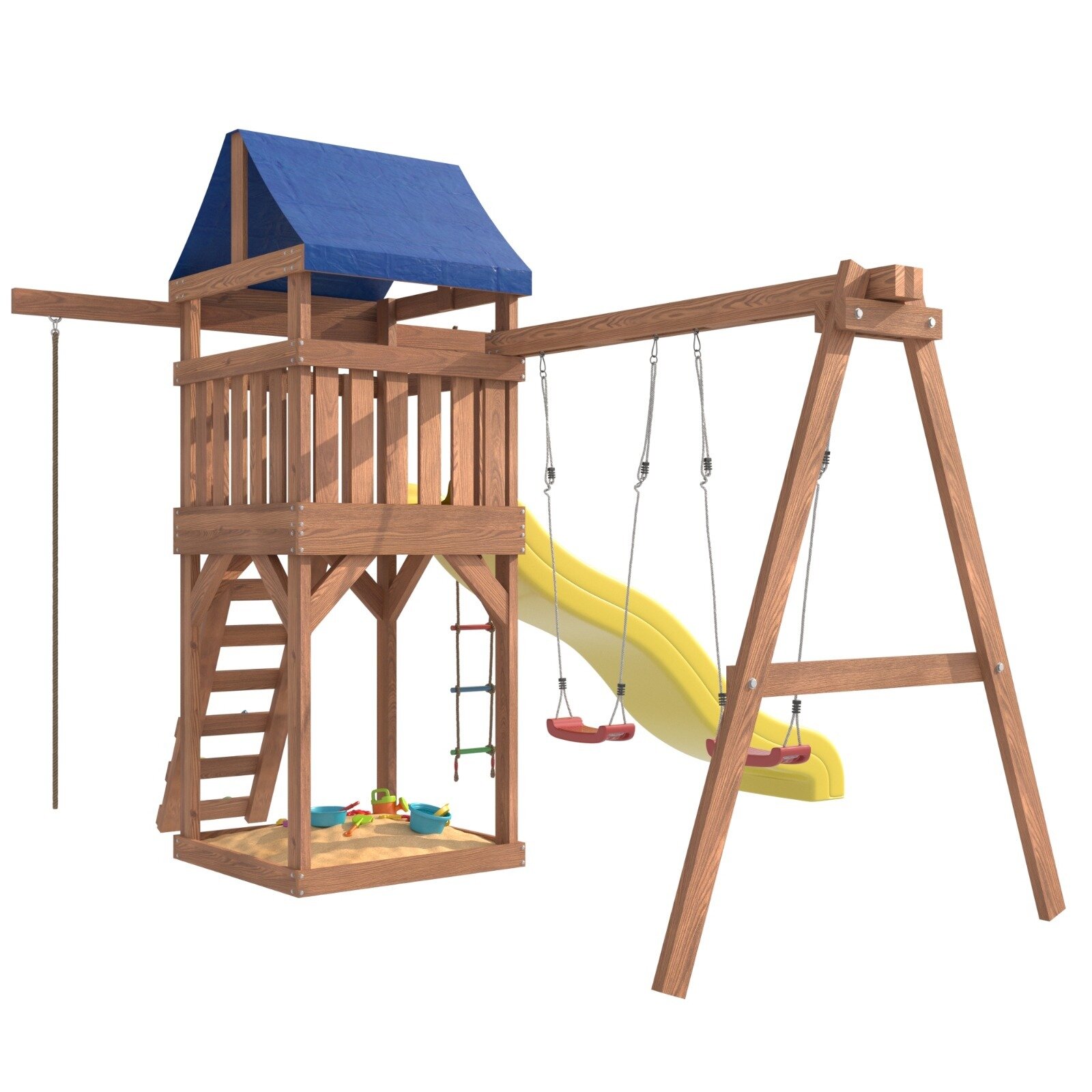 | Комплектация | Башня с тентом; Подвесные качели Лодочка (2шт); Веревочная лестница; Канат; Горка; Скалодром; Песочница под башне |