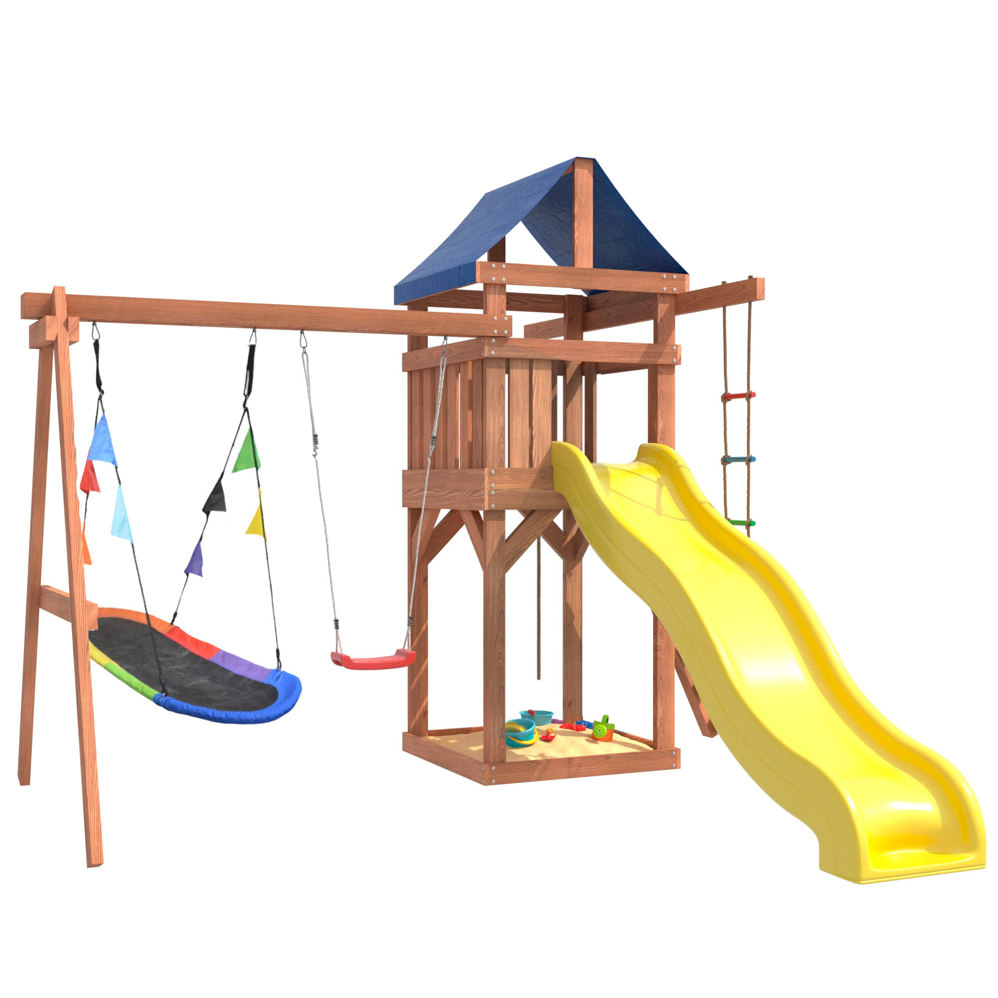 | Комплектация | Башня с тентом; Подвесные качели Лодочка и овальное разноцветное гнездо; Веревочная лестница; Канат; Горка; Скалодром; Песочница под башней |