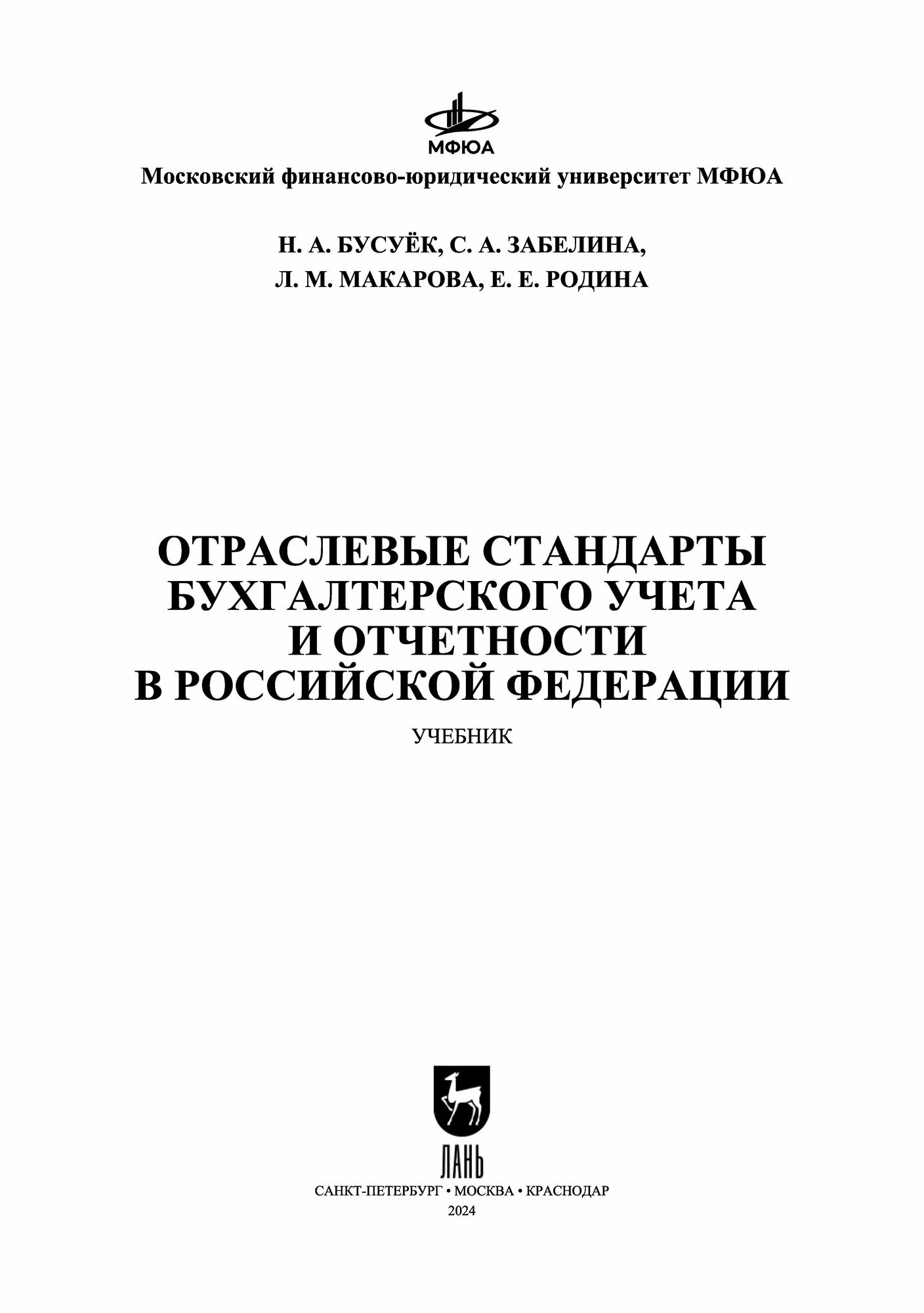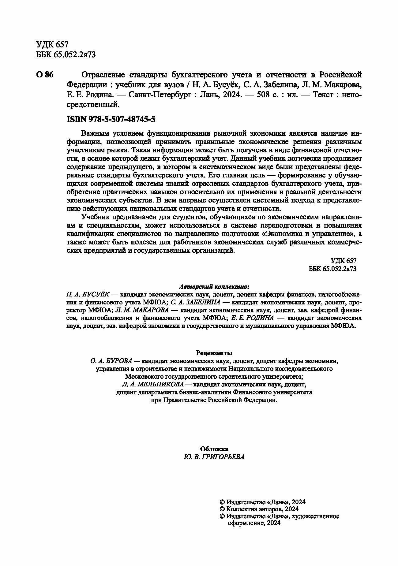 Отраслевые стандарты бухгалтерского учета и отчетности в Российской Федерации. Учебник для вузов (Бусуек Наталья Александровна, Забелина Светлана Алексеевна, Макарова Людмила Михайловна); Лань, 2024
