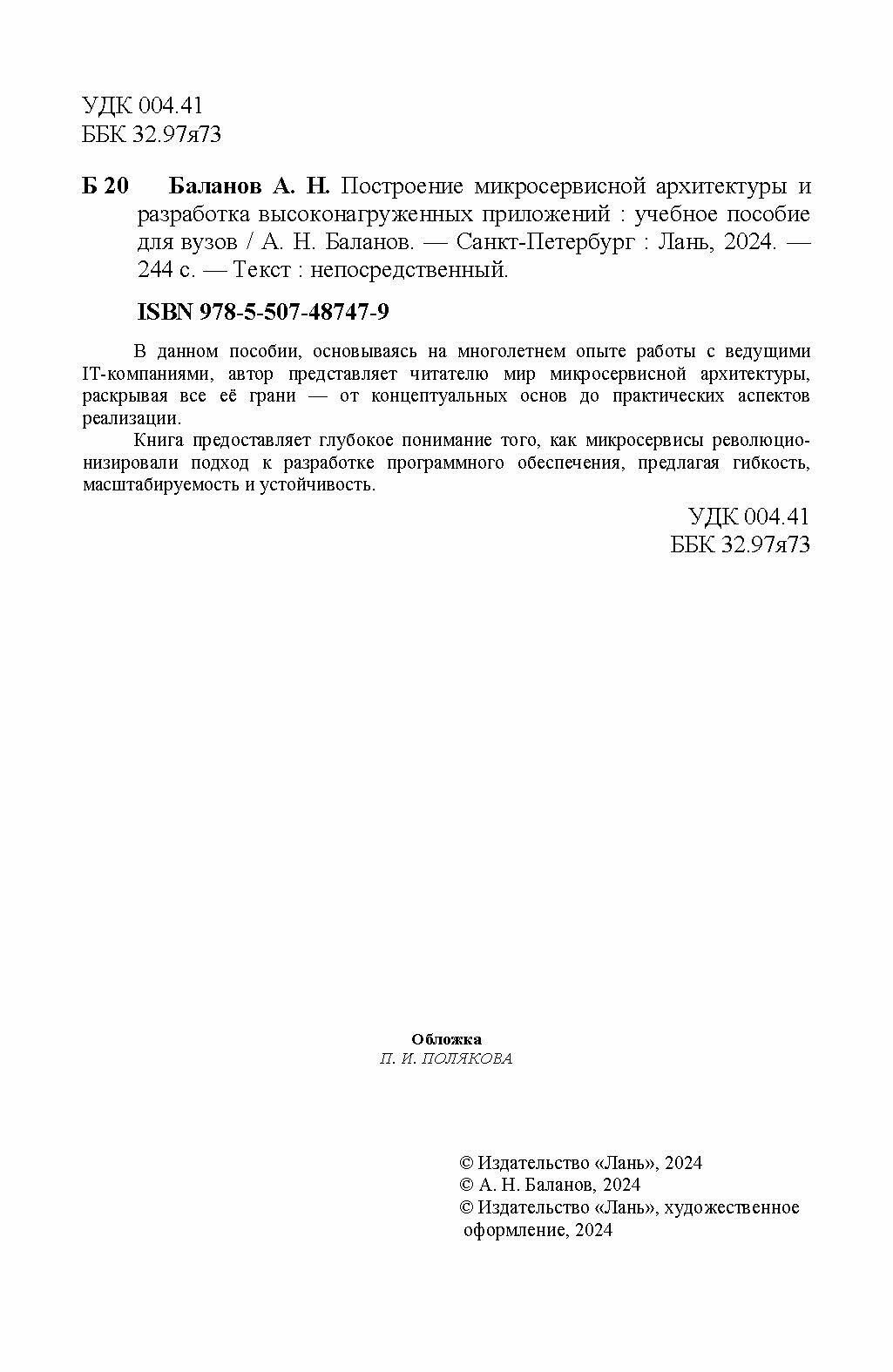 Построение микросервисной архитектуры и разработка высоконагруженных приложений. Учебное пособие (Баланов Антон Николаевич); Лань, 2024