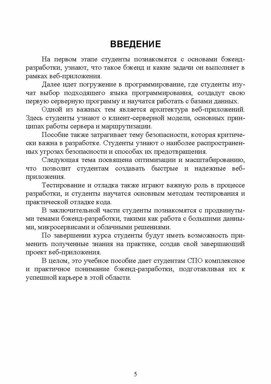 Бэкенд-разработка играет ключевую роль в создании функциональных веб-приложений. Это учебное пособие предназначено для студентов среднего профессионального образования (СПО) и направлено на освоение основ бэкенд-разработки веб-приложений. Соответствует современным требованиям Федерального государственного образовательного стандарта среднего профессионального образования и профессиональным квалификационным требованиям.