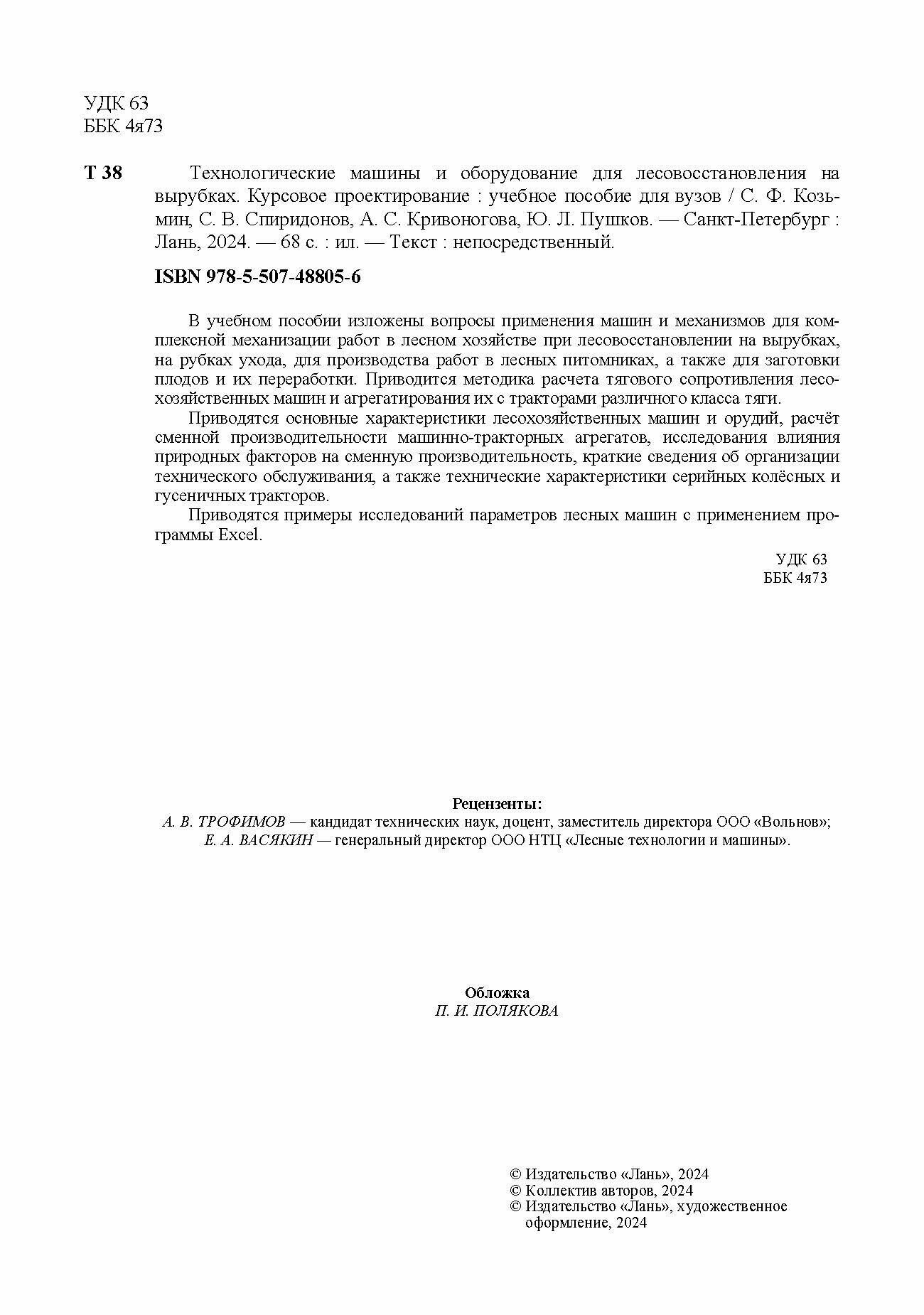 Технологические машины и оборудование для лесовосстановления на вырубках. Курсовое проектирование (Козьмин Сергей Федорович, Кривоногова Александра Станиславовна, Спиридонов Сергей Васильевич); Лань, 2024