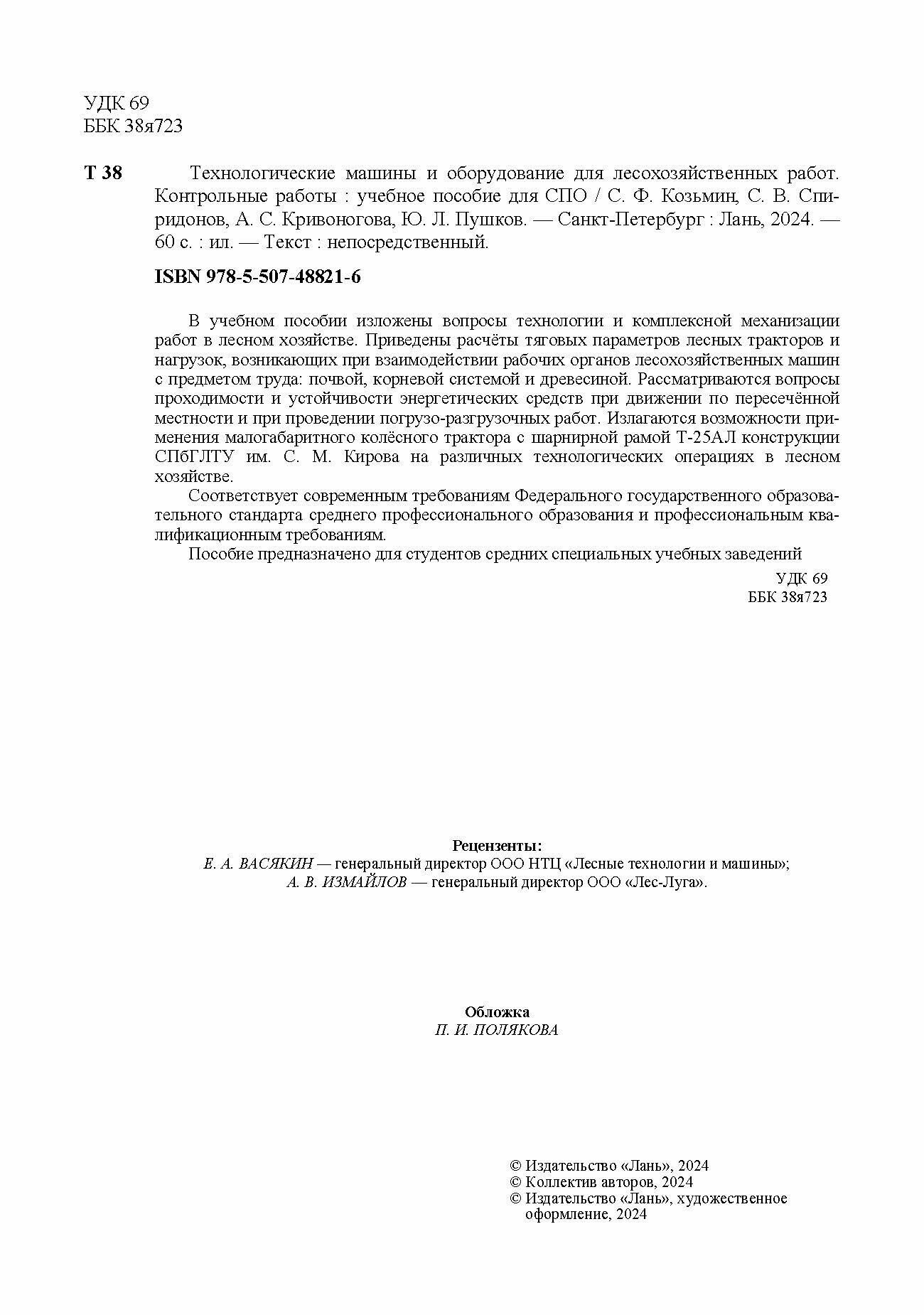 Технологические машины и оборудование для лесохозяйственных работ. Контрольные работы (Козьмин Сергей Федорович, Кривоногова Александра Станиславовна, Спиридонов Сергей Васильевич); Лань, 2024