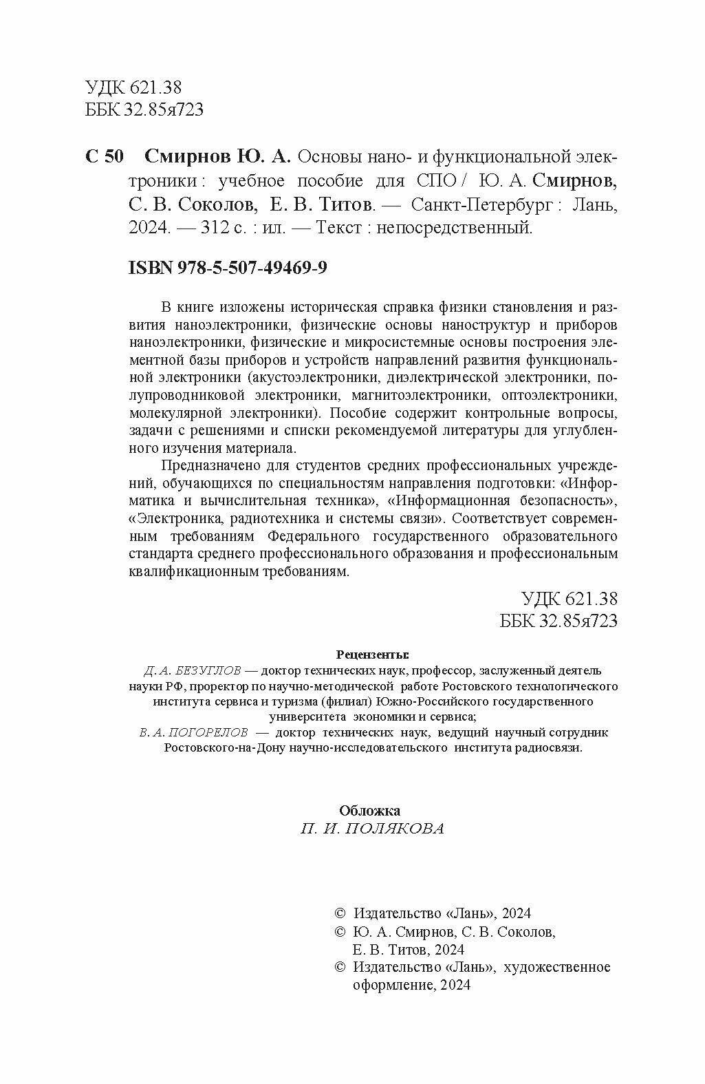 Основы нано- и функциональной электроники. Учебное пособие для СПО (Смирнов Юрий Александрович, Соколов Сергей Викторович, Титов Евгений Вадимович); Лань, 2024