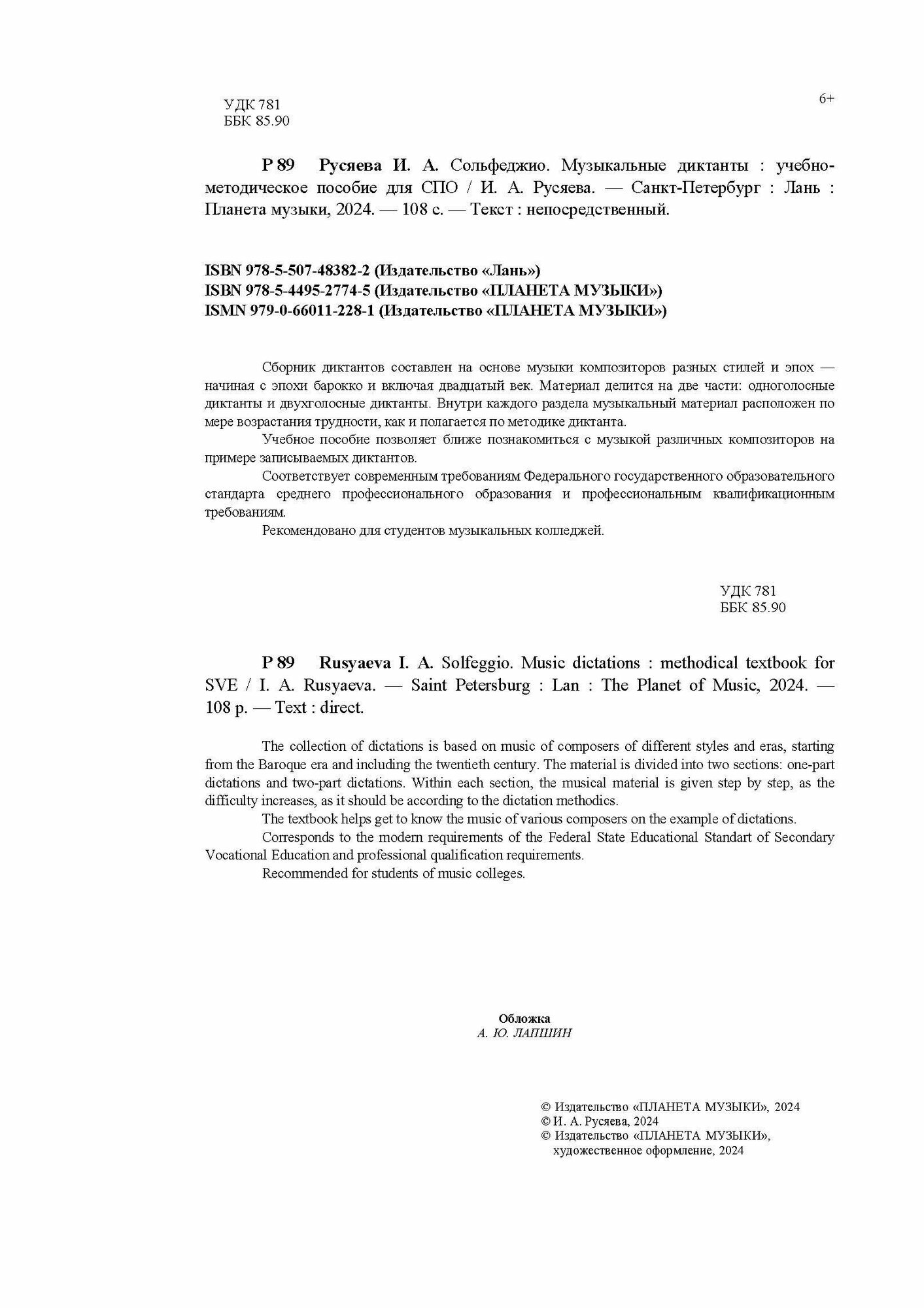 Сольфеджио. Музыкальные диктанты. Учебно-методическое пособие для СПО (Русяева Ирина Анатольевна); Планета Музыки, 2024