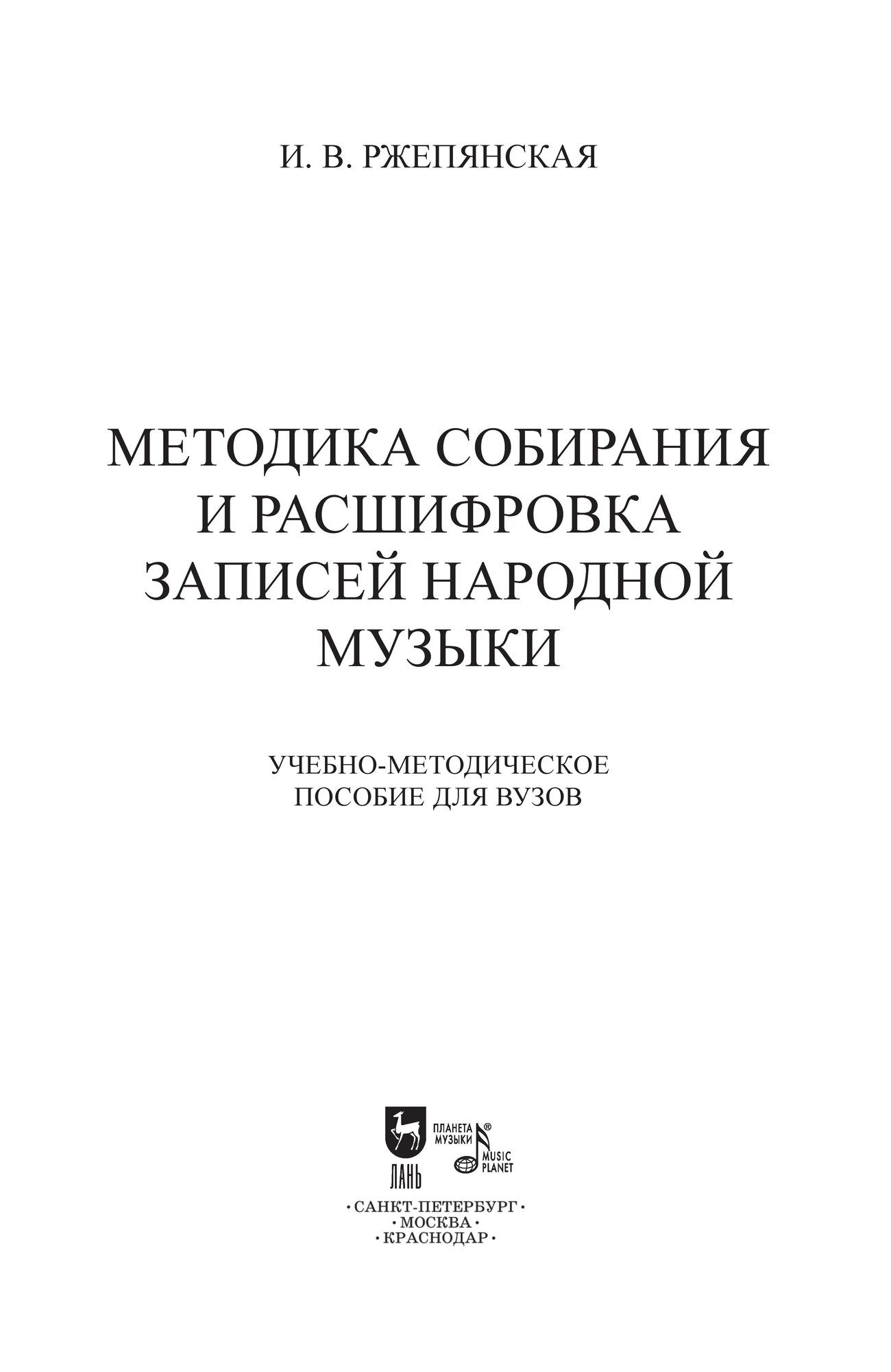 Методика собирания и расшифровка записей народной музыки. Учебно-методическое пособие для вузов (И. В. Ржепянская); Издательство «Планета музыки», 2024