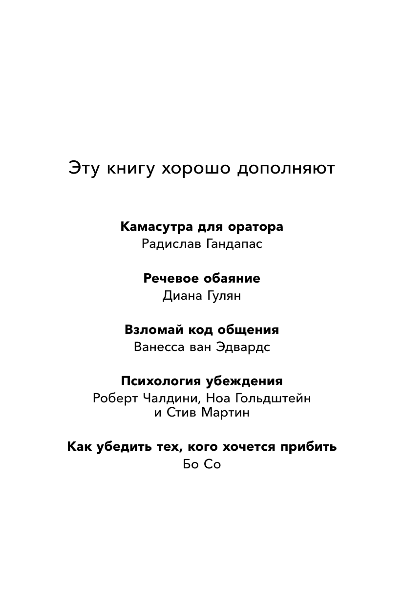 Вы эксперт в своем деле, но вам сложно убедительно доносить до других ваши идеи или презентовать результаты работы, а мысль о публичном выступлении вызывает дрожь в коленках? С этим можно справиться. Практически любой человек способен развить навык интересно выступать. Вот только помимо техник для совершенствования ораторского мастерства нужно проработать свои психологические ограничения. Телеведущий и психолог Сергей Тугушев рассказывает, как это сделать. Благодаря упражнениям, которые он предлагает, вы:избавитесь от мешающих психологических убеждений;перепрограммируете своего внутреннего критика;научитесь справляться с волнением и преодолеете страх публичных выступлений.В конце книги приведена трехнедельная программа. После ее прохождения вы будете чувствовать себя комфортно перед любой аудиторией и начнете говорить так, что вас станут слушать.