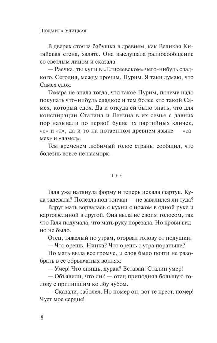 НАСТОЯЩИЙ МАТЕРИАЛ (ИНФОРМАЦИЮ) ПРОИЗВЕЛ ИНОСТРАННЫЙ АГЕНТ УЛИЦКАЯ ЛЮДМИЛА ЕВГЕНЬЕВНА, ЛИБО МАТЕРИАЛ (ИНФОРМАЦИЯ) КАСАЕТСЯ ДЕЯТЕЛЬНОСТИ ДАННОГО ИНОСТРАННОГО АГЕНТА. Людмилу Улицкую не раз называли очень внимательным свидетелем эпохи, ее цепким наблюдателем и интерпретатором. Пожалуй, более всего это относится к роману «Зеленый шатер». Роману о поколении тех, кому выпало взрослеть во времена оттепели, выбирать судьбу в шестидесятые, платить по счетам в семидесятые и далее… как получится, у всех по-разному. Калейдоскоп судеб от смерти Сталина до смерти Бродского, хор голосов и сольные партии, переплетение исторических реалий и художественного вымысла…